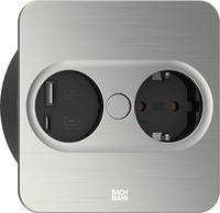 Bachmann TWIST 2 Metallische Abdeckscheibe eckig, Edelstahl-Optik, 1xSchutzkontaktsteckdose schwarz mit erhöhtem Berührungsschutz, 1xUSB A/C 22W Charger, Zuleitung 2,0m H05VV-F3G1,5mm² schwarz mit Aderendhülsen und beigelegtem Schutzkontakt-Montagestecker, verpack (946.005)