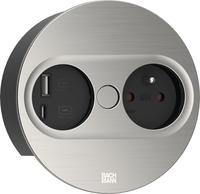 Bachmann TWIST 2 Metallische Abdeckscheibe rund, Edelstahl-Optik, 1xUTE Frankreich Steckdose schwarz mit erhöhtem Berührungsschutz, 1xUSB A/C 22W Charger, Zuleitung 2,0m H05VV-F3G1,5mm² schwarz mit Aderendhülsen und beigelegtem Schutzkontakt-Montagestecker, verpac (946.006)
