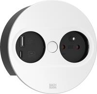 Bachmann TWIST 2 Metallische Abdeckscheibe rund, weiß matt, ähnlich RAL 9010 30GE seidenmatt, 1xUTE Frankreich Steckdose schwarz mit erhöhtem Berührungsschutz, 1xUSB A/C 22W Charger, Zuleitung 2,0m H05VV-F3G1,5mm² schwarz mit Aderendhülsen und beigelegtem Schutzko (946.206)