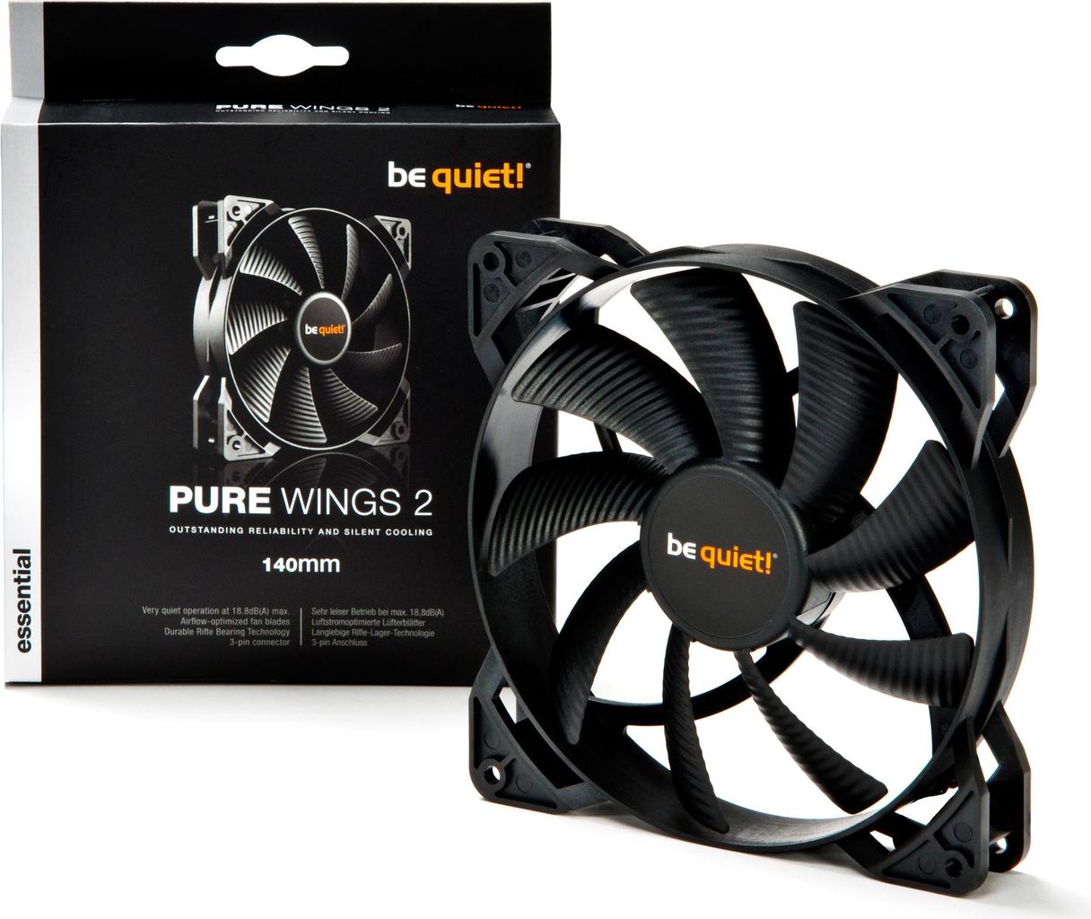 Der Pure Wings 2 140 mm Lüfter ist das größte Modell der Serie und vereint alle oben genannten essentiellen Produkt-Highlights. Neun Lüfterblätter fördern mehr Luft und sorgen für erhöhten Luftdruck bei einem beeindruckend leisen Betrieb von 18,8 dB(A). Durch den höheren Luftdruck ist der Pure Wings 2 140 mm gerade für den Einsatz auf Wasser- oder Luftkühlern prädestiniert.