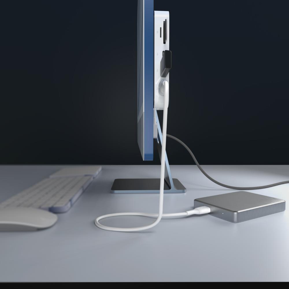 Schaffen Sie einen Mini-Arbeitsplatz für Ihren iMac oder PC mit dem USB-C 6-in-1 Multiport Hub mit Halterung. Sein kompaktes und leichtes Design ermöglicht die diskrete Montage an der Rückseite eines Monitors, Computerständers oder Monitorsockels. So können Sie Ihr Gerät mit zusätzlichen Anschlüssen, Peripheriegeräten, SD-Karten und High-Speed-Internet verbinden und gleichzeitig das Durcheinander auf dem Schreibtisch reduzieren. Die Halterung verfügt über eine Schnelllösetaste, mit der Sie den Hub unterwegs einfach abnehmen können. Mit einer Datenübertragungsgeschwindigkeit von bis zu 10 Gbit/s ist der Multiport-Hub doppelt so schnell wie USB 3.0 und ermöglicht eine schnelle Übertragung von Daten und Bildern.