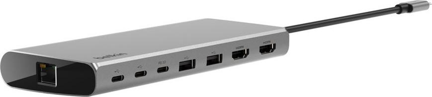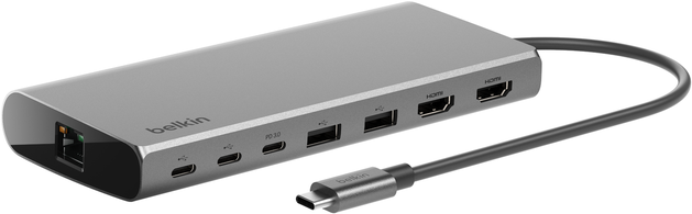 Der Belkin CONNECT 8-in-1 Dual Display Core Hub wurde entwickelt, um Ihre Produktivität und Ihr Unterhaltungserlebnis durch seine vielseitigen Anschlussmöglichkeiten zu verbessern. Diese Dockingstation verfügt über ein integriertes USB-C-Kabel und bietet eine breite Palette an Anschlüssen, darunter USB-C 3.2, USB 3.0 und zwei HDMI-Schnittstellen, wodurch sie mit einer Vielzahl von Geräten und Peripheriegeräten kompatibel ist. Mit Unterstützung für zwei 4K-HDMI-Displays liefert er atemberaubende Bilder bei einer Bildwiederholfrequenz von 60 Hz, perfekt für High-Definition-Gaming und professionelle Anwendungen. Der Hub verfügt außerdem über einen Gigabit-Ethernet-Anschluss für zuverlässige, schnelle Netzwerkverbindungen und USB-C mit Power Delivery (100 W) zum Aufladen von Laptops und anderen Geräten. Das robuste Aluminiumgehäuse und die Silicon Motion-Technologie sorgen für eine langlebige Leistung und machen ihn zu einem unverzichtbaren Werkzeug für alle, die die Konnektivität ihres Geräts erweitern und gleichzeitig einen sauberen und effizienten Arbeitsbereich aufrechterhalten möchten.