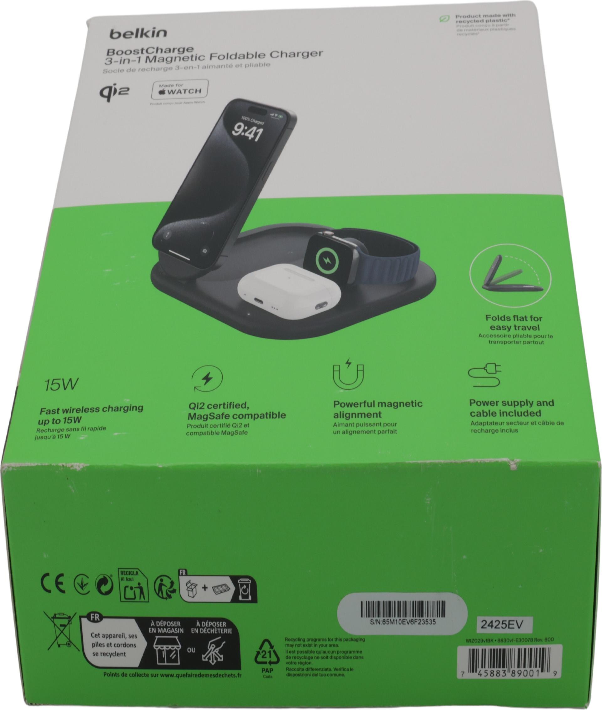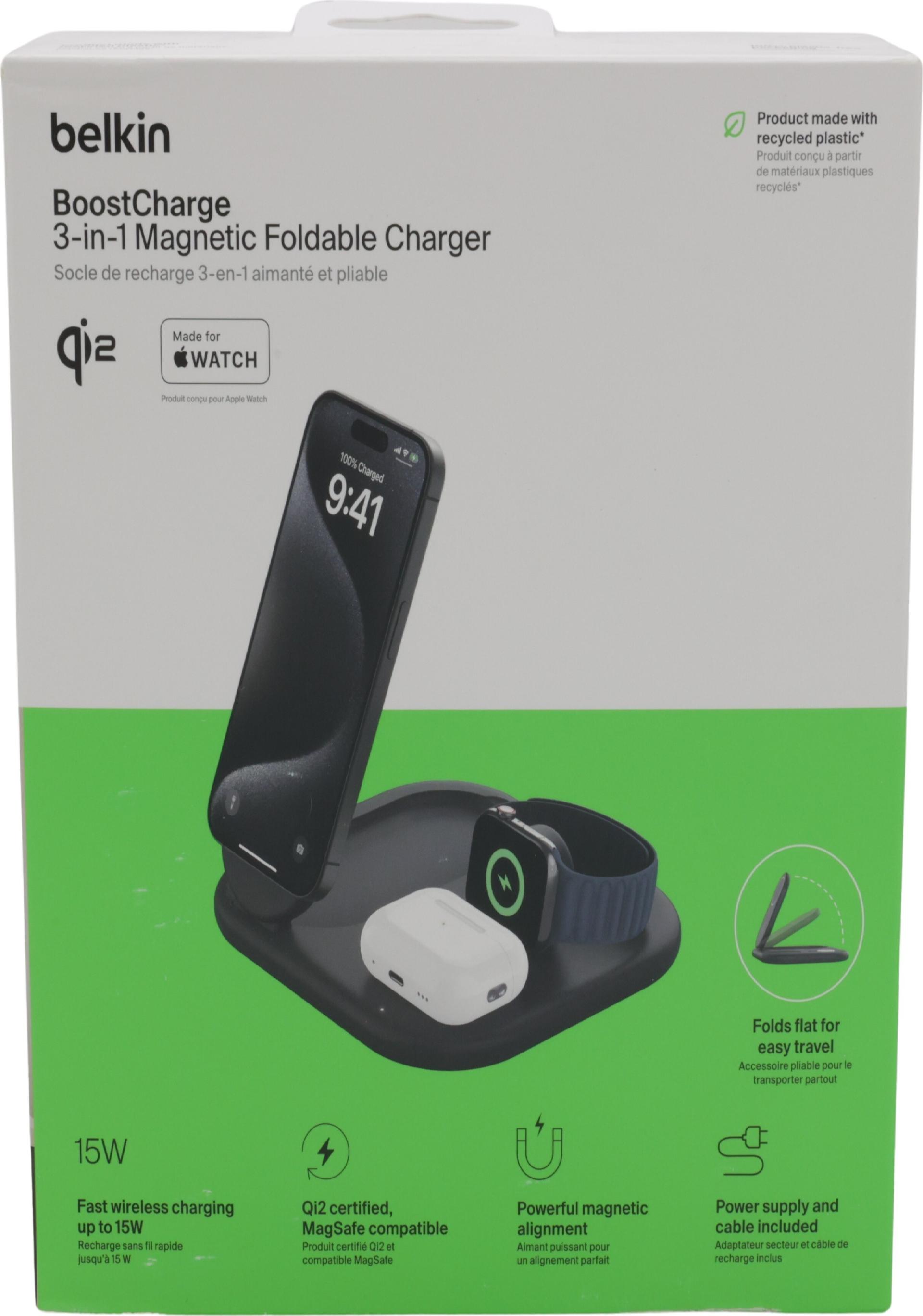 | Produktbeschreibung | Belkin BoostCharge 3-in-1 Kabelloses Ladegerät - magnetisch, faltbar, mit Qi2 - + AC-Netzteil - 15 Watt |