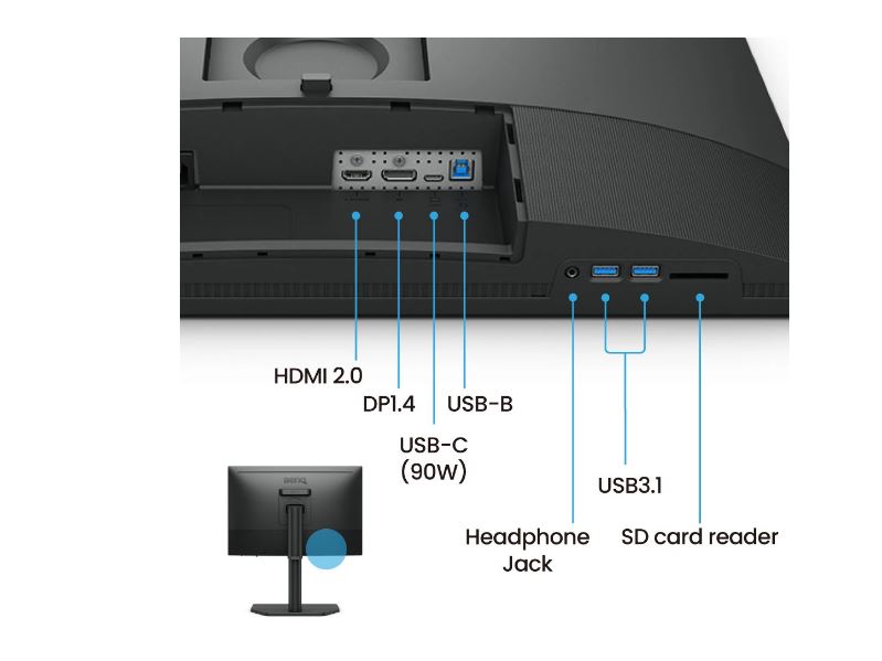 1x HDMI 2.0 (60Hz@2560x1600), 1x DisplayPort 1.4 (60Hz@2560x1600), 1x USB-C 3.0 mit DisplayPort 1.4 (Upstream, 5Gb/?s, PD 90W, 60Hz@2560x1600), 1x USB-B 3.0 (Upstream, 5Gb/?s), 2x USB-A 3.0 (Downstream, 5Gb/?s), 1x 3.5mm Klinke (Line-Out), 1x SD Card, 1x AC-In C13 (Netzanschluss) |