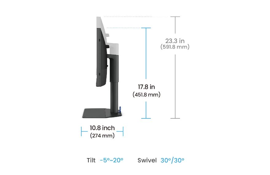 mit Standfuß, höhenverstellbar (120mm), Pivot (+90°), drehbar (±30°), neigbar (+20°/?-5°) |