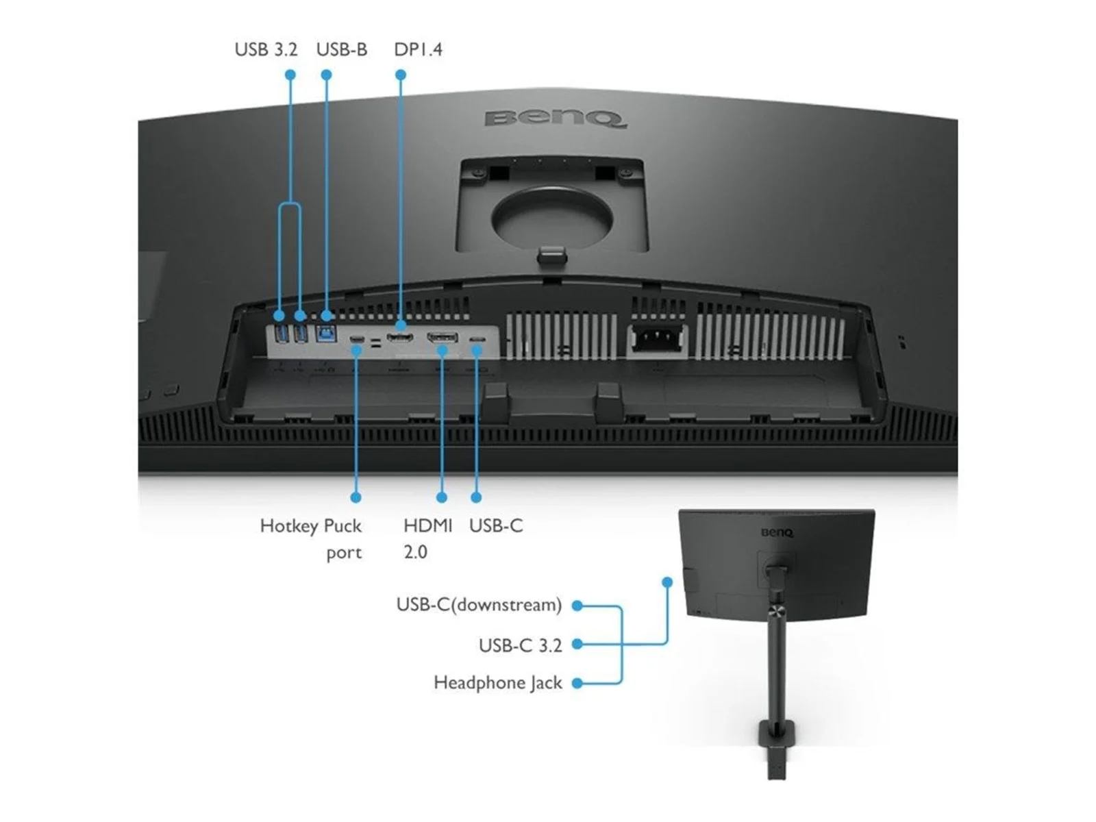 1x DisplayPort 1.4, 1x HDMI 2.0, 1x USB-C 3.0 mit DisplayPort 1.4 (Upstream, 5Gb/?s, PD 90W), 1x USB-C 3.0 (Downstream, 5Gb/?s), 2x USB-B 3.0 (Upstream, 5Gb/?s), 2x USB-A 3.0 (Downstream, 5Gb/?s), 1x 3.5mm Klinke Line-Out, 1x AC-In C14 (Netzanschluss) |
