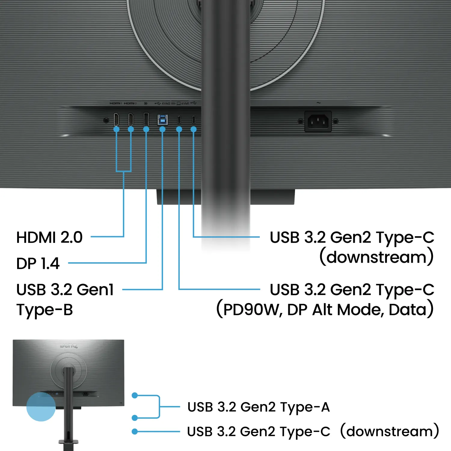 1x DisplayPort 1.4 (60Hz@3840x2160), 2x HDMI 2.0 (60Hz@3840x2160), 1x USB-C 3.0 mit DisplayPort 1.4 (Upstream, 5Gb/?s, PD 90W, 60Hz@3840x2160), 1x USB-C 3.0 (Downstream, 5Gb/?s, BC), 1x USB-C 3.0 (Downstream, 5Gb/?s, BC 7.5W), 1x USB-B 3.0 (Upstream, 5Gb/?s), 2x USB-A 3.0 (Downstream, 5Gb/?s, BC 4.5W), 1x 3.5mm Klinke Line-Out, 1x AC-In C14 (Netzanschluss) |