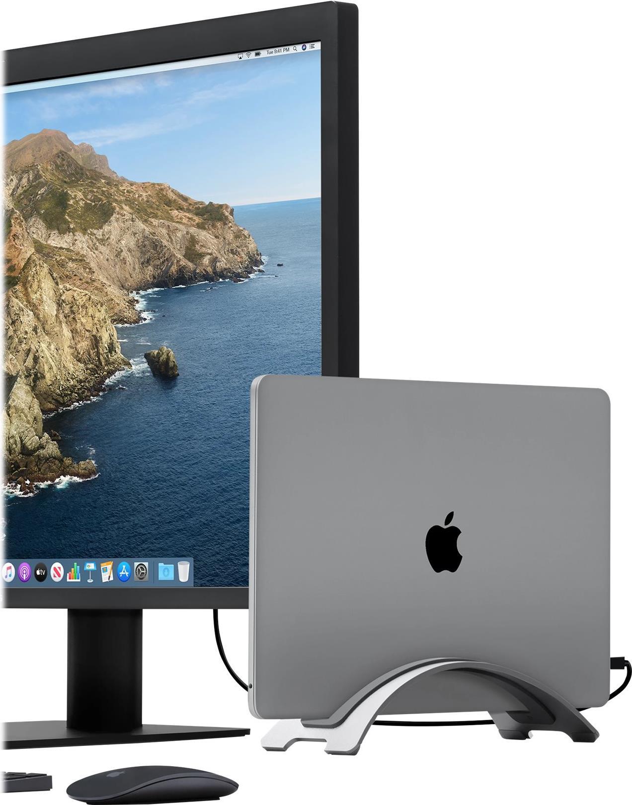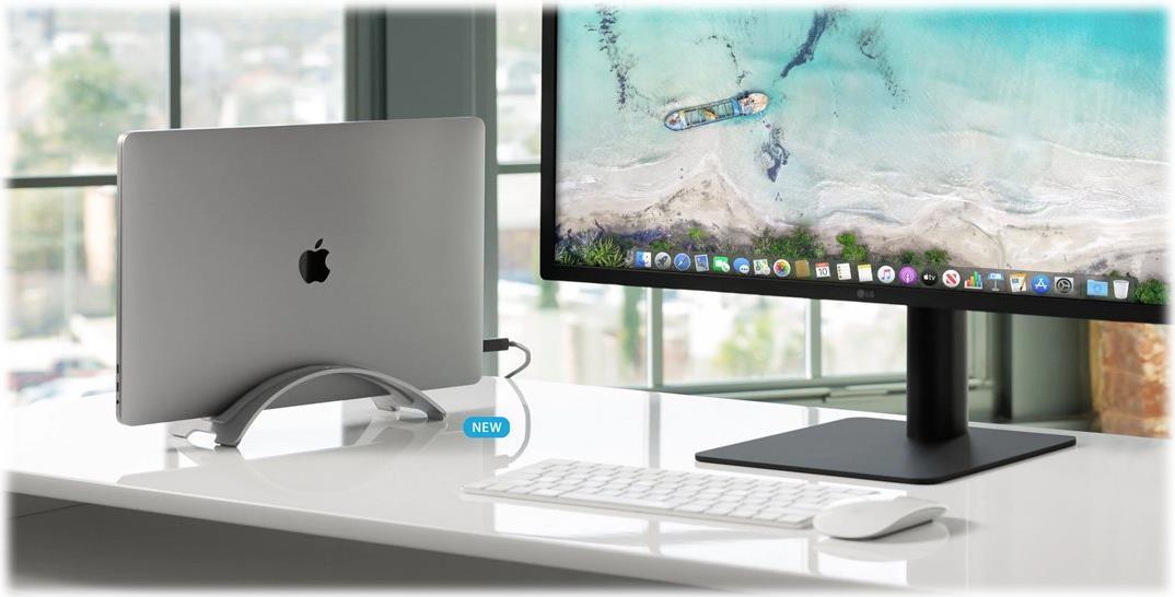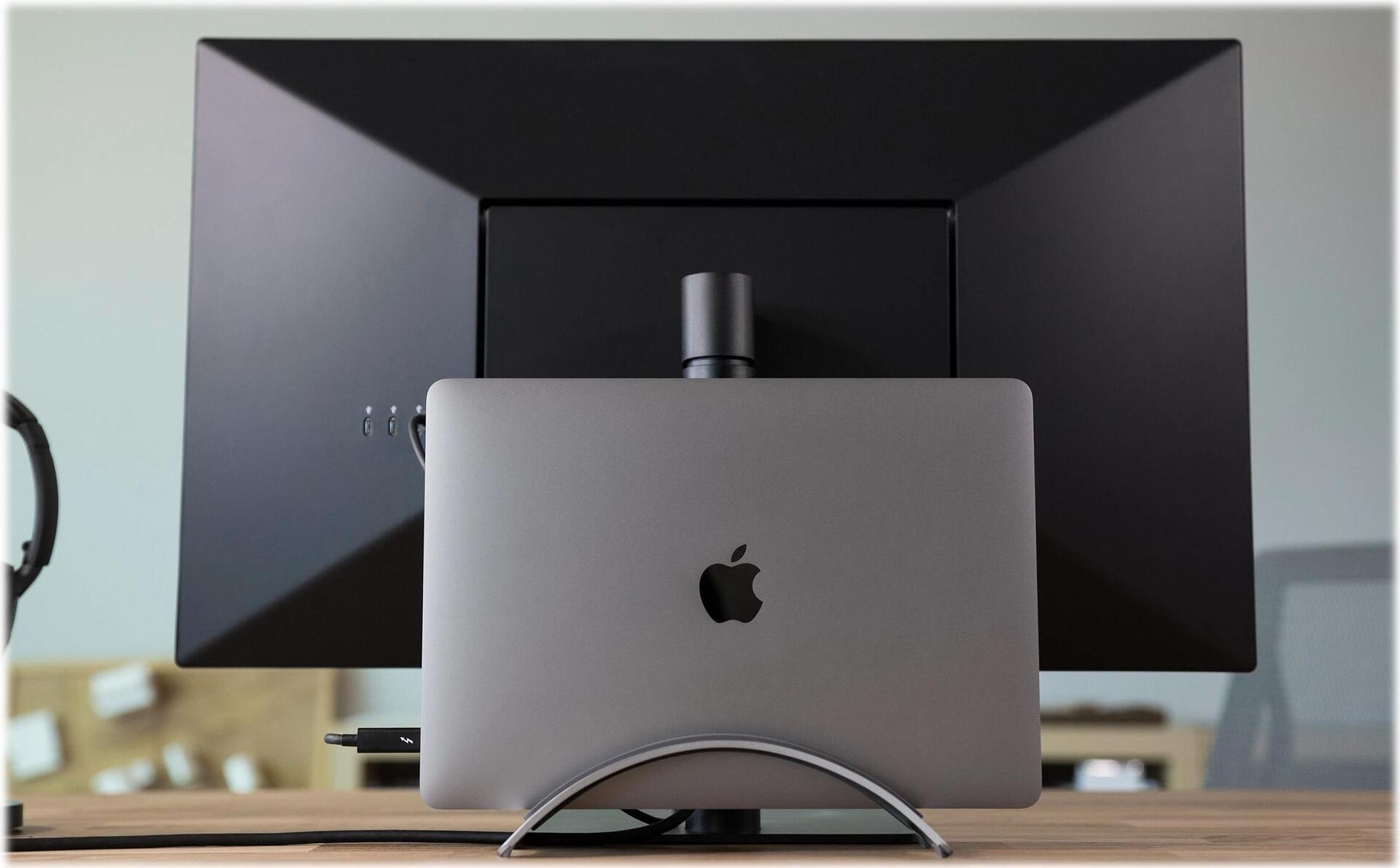BookArc ist der kleine MacBook-Ständer, der Platz für einen großen Monitor schafft. Wie das geht? Er hält das MacBook vertikal und nicht auf dem Schreibtisch. Stellen Sie Ihr MacBook auf den BookArc, schließen Sie Ihren externen Monitor, Ihre Tastatur und Maus an. Jetzt haben Sie ein kompaktes Notebook in einen komfortablen Schreibtisch für zu Hause oder Ihr Büro verwandelt. Dinge wie Fotobearbeitung, Tabellenkalkulationen und andere Projekte sind auf einem hellen 24-Zoll-Bildschirm (oder größer) besser zu sehen. Wenn es an der Zeit ist, mobil zu werden oder zu einem Meeting zu gehen, ziehen Sie Ihre Desktop-Verbindungen ab und der BookArc Cable Catch hält sie für Sie an Ort und Stelle.Hauptmerkmale