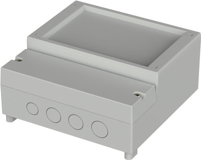 Das Gehäuse mit eingespritzten Nuten für den Karteneinschub senkrecht und waagerecht, Montagenocken und im Klemmraum Anschraubpunkte für Tragschienen. Aufhängung für Wandmontage ...
