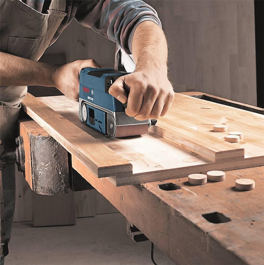 Der GBS 75 AE Professional ist der robuste Bandschleifer von Bosch für maximalen Materialabtrag. Er verfügt über Aluminiumrollen für hohe Beanspruchung. Der Schleifer besitzt einen robusten Zahnriemen und Metallzahnriemenräder, die für eine lange Werkzeuglebensdauer sorgen. Er kann auch einfach umgedreht und als stationäres Elektrowerkzeug verwendet werden. Der Schleifer eignet sich zum Entfernen von Lack, Oberflächenschleifen, Glätten und Reinigen von Oberflächen sowie zur Fußbodenrenovierung. Er ist einsetzbar auf Holz-, Metall- und Kunststoffoberflächen. Das Gerät ist durch einen Staubadapter kompatibel mit dem Bosch Click & Clean System.