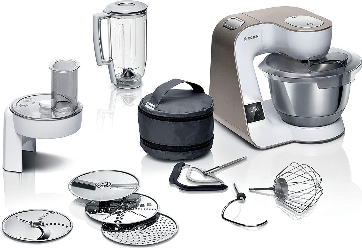 Produkttext[/head]Einfache Reinigung dank spülmaschinenfestem Zubehör.Die Reinigung eines Geräts nach der Zubereitung kostet in der Regel mehr Zeit, als Ihnen lieb ist. Jetzt können Sie sich freuen. Denn das Zubehör ist im Allgemeinen spülmaschinenfest und lässt sich einfach und bequem in der Geschirrspülmaschine reinigen. Das spart Zeit und schont die Hände.Breites Sortiment an optionalem Zubehör für jeden Geschmack.Jeder hat individuelle Koch- und Backvorlieben. Wenn nicht bereits enthalten, steht eine große Auswahl an hochwertigem Zubehör zur Verfügung, z. B. eine Eismaschine, Getreidemühle, ein Multi-Mixer, Gebäckvorsatz, Fleischwolf, ein Mixer und vieles mehr. Bosch hat für jeden Geschmack das passende Zubehör.3D Planetary Mixing – Rühren in neuen Dimensionen.Das weiterentwickelte, einzigartige planetarische Rührsystem ermöglicht eine stets kraftvolle Rührbewegung in drei Dimensionen. So werden alle Zutaten besonders gründlich und immer optimal vermengt – das Ergebnis ist stets perfekt.Automatische Kabelaufwicklung für schnelle Aufbewahrung.Ein Kabel sollte am besten unsichtbar sein. Und dank der einfachen Kabelaufwicklung ist das auch möglich. Kurzer Zug am Kabel und es verschwindet automatisch im Geräteinneren. Somit haben Sie mehr Platz für andere Küchenutensilien.Zubehör kann in der Schüssel aufbewahrt werden.Suchen Sie nie wieder nach dem Zubehör! Das Patisserie-Set kann nach Gebrauch zusammen mit den Scheiben einfach in die praktische Zubehörtasche gelegt werden. Diese kann direkt in der Schüssel aufbewahrt werden und ist so immer in der Nähe der Küchenmaschine griffbereit.Einfaches Befüllen durch automatische Parkpositionierung.Lassen Sie sich nicht durch das umständliche Einfüllen von Zutaten die gute Backlaune verderben. Bei der automatischen Parkposition bleiben die Teigwerkzeuge an der Rückwand der Schüssel stehen. Dadurch können Sie die Schüssel ganz einfach von vorne befüllen.Leichter Weg zu perfekten Ergebnissen mit integriertem Timer.Keiner kennt Ihr Lieblingsrezept so gut wie Sie und weiß, wie lange die Zutaten geknetet, gerührt oder gemixt werden müssen. Mit dem Timer können Sie die Verarbeitungszeit immer im Auge behalten und währenddessen andere Dinge vorbereiten.Inklusive Patisserie-Set für perfekte Ergebnisse.Kreative Back- und Kochideen erfordern spezielles Zubehör. Das Profi Patisserie-Set inklusive flexiblem Rührbesen mit Silikonkante, höhenverstellbarem Vollmetall-Schlagbesen und Knethaken sorgt für perfekte Ergebnisse und einfache Handhabung. Das Set ist spülmaschinenfest.Integrierte Waage für mehr Effizienz und weniger Reinigung.Warum mehrere Geräte verwenden, wenn es mit einem funktioniert. Dank der integrierten Waage können Sie die Zutaten aus Ihrem Rezept direkt in der Schüssel oder in anderen Zubehören wiegen. Dies ist effizient und zeitsparend, da Sie keine weitere Schüssel reinigen müssen.Rührarm bewegt sich einfach auf Knopfdruck.Der Wechsel der Rührwerkzeuge sollte so einfach wie möglich sein. Der EasyArmLift bietet zusätzlichen Komfort für Ihre Koch- und Backideen. Auf Knopfdruck hebt sich der Rührarm von selbst. Das ist nicht nur einfach, sondern auch schnell.Große Schüssel für die optimale Zubereitung der Teige.Man erkennt eine optimale Schüssel nicht nur an ihrer Größe. Für beste Ergebnisse sind Innenform unserer Schüssel und Werkzeuge aufeinander abgestimmt. Die hochwertige, große Edelstahlschüssel mit 3,9 l Fassungsvermögen eignet sich problemlos sowohl für kleine Mengen als auch für 2,7 kg Kuchen- und Hefeteig.Perfekte Ergebnisse dank dreidimensionalem Rührsystem.Für perfekte Ergebnisse müssen Zutaten gut miteinander vermengt werden. 3D PlanetaryMixing heißt: Die Werkzeuge bewegen sich in 3 Richtungen, der Sockel entgegengesetzt dazu. Dadurch werden Zutaten von der Seite, dem Boden und der Mitte der Schüssel aufgenommen, was den Teig so geschmeidig macht.Extra starker Motor für hohe Mischanforderungen.Möchten Sie nach hohen Standards backen und kochen können? Dank des extra starken Motors können Sie alle Ihre Back- und Kochideen problemlos realisieren. Damit gelingt eine einfache Verarbeitung von schweren Teigen ebenso wie von großen Mengen Mehl und Zutaten.Leichte, schnelle Zubereitung mit 7 Geschwindigkeitsstufen.Jedes Zubehörteil erfordert eine unterschiedliche Geschwindigkeitseinstellung. Dank 7 individueller Geschwindigkeitsstufen lassen sich Ihre Gerichte schnell, einfach und präzise zubereiten. Sie möchten mehr Geschwindigkeit oder Smoothies im Mixer anfertigen? Nutzen Sie einfach die Momentstufe dafür.Gummifüße für Stabilität und hohe Sicherheit.Bei der Sicherheit darf es keine Kompromisse geben. Gummifüße garantieren die Stabilität der Küchenmaschine und verhindern Verrutschen. Abgedeckte Antriebe tragen zum hohen Sicherheitsstandard bei. Die elektronische Sicherheitsabschaltung lässt ein unerwartetes Starten des Motors erst gar nicht zu.[head]Hauptmerkmale