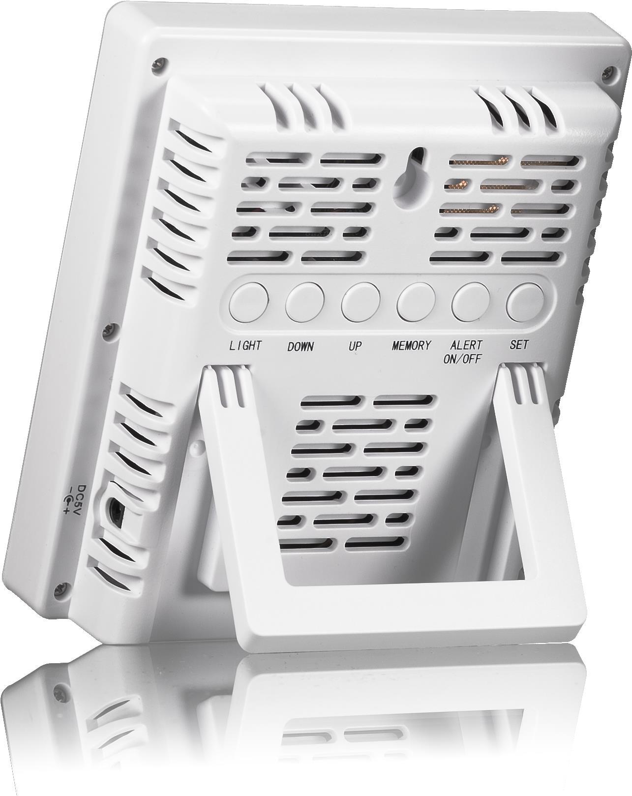 Der praktische Kohlendioxid-Alarm erinnert Sie daran, wenn Sie frische Luft hereinlassen müssen. Wenn die Standardeinstellung von Ihrem idealen Raumklima abweicht, können Sie Ihren eigenen Grenzwert bis zu einem Maximum von 5000 ppm einstellen. Die Alarmfunktion kann dann mit einem einfachen Tastendruck aktiviert werden. Wird der voreingestellte Grenzwert überschritten, ertönt der Alarm je nach CO2-Konzentration in unterschiedlicher Intensität. Auf dem Display erscheint außerdem ein blinkendes Pfeilsymbol, um Sie daran zu erinnern, die Fenster zu öffnen. Auch die Luftfeuchtigkeit ist ein wichtiger Faktor, denn eine hohe Luftfeuchtigkeit kann zu Schimmelbildung führen. Sie können auch einen eigenen visuellen Alarm für diesen Messwert einstellen, damit Sie wissen, ob die Luft im Raum zu trocken oder zu feucht ist. Wenn Sie mehr als nur die aktuellen Messwerte sehen wollen, gibt es auch eine praktische Speicherfunktion, die die Maximal- und Minimalwerte der letzten 24 Stunden sowie die Durchschnittswerte der letzten 15 Minuten und 8 Stunden für Kohlendioxidkonzentration, Temperatur und Luftfeuchtigkeit anzeigt. Das Gerät wird über ein Netzteil mit Strom versorgt, um einen Dauerbetrieb zu ermöglichen.