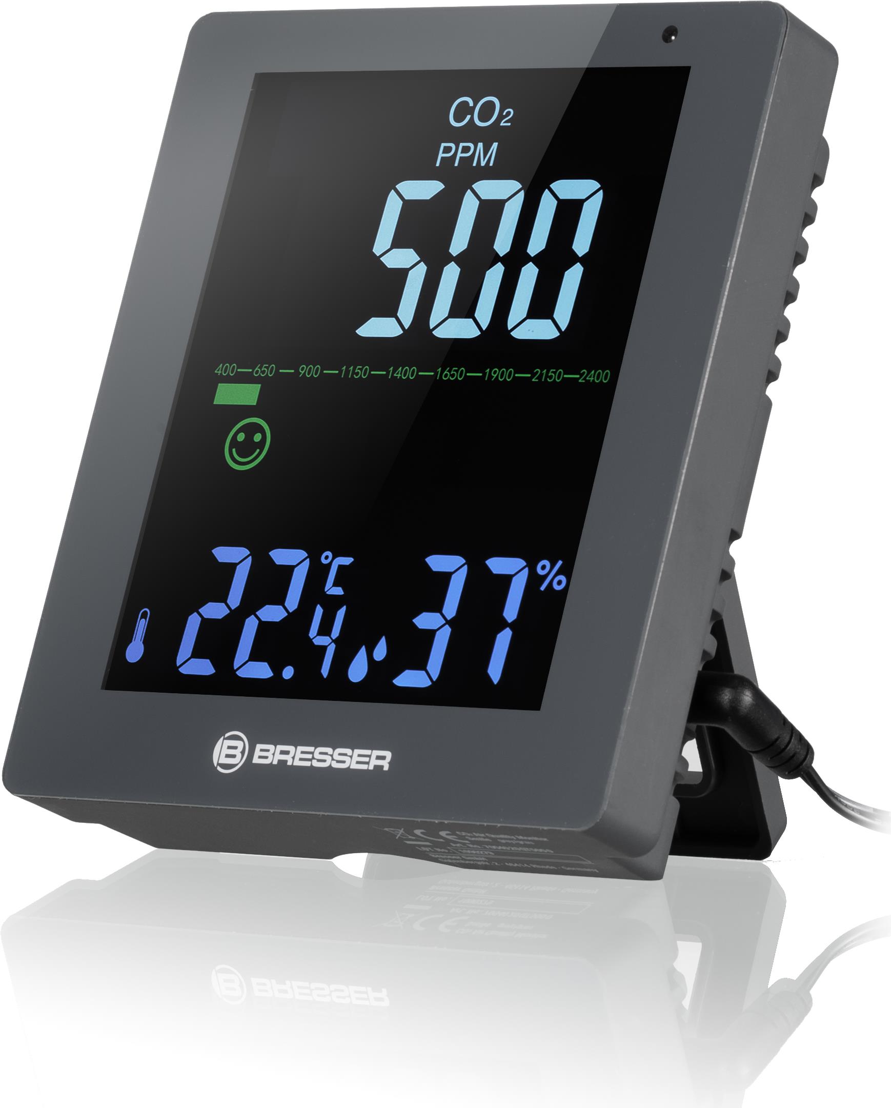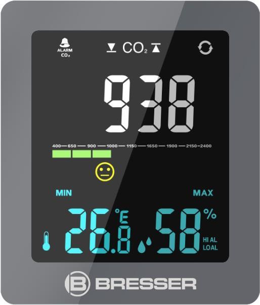 Überwachung und Steuerung der Raumluftqualität durch Messung von CO2-Belastung, Luftfeuchtigkeit und Temperatur sowie Ausgabe von Lüftungsempfehlungen. Der BRESSER Smile CO2-Luftqualitätsmonitor - die perfekte Lösung für fleißige Frischluftfans!Endlose Meetings, dringende E-Mails von der Arbeit, die Kinder betreuen, die Wohnung putzen... bei einem hektischen Lebensstil vergisst man leicht das regelmäßige Lüften. Auch wenn Sie es wahrscheinlich besser wissen: Eine hohe CO2-Konzentration kann Ihre Gesundheit und Ihr Wohlbefinden beeinträchtigen. Der BRESSER Smile CO2-Luftqualitätsmonitor zeigt Ihnen, wann es an der Zeit ist, frische Luft in Ihr Zuhause oder Büro zu lassen. Ein kurzer Blick auf das intuitive LED-Display genügt, um die CO2-Konzentration, Temperatur und Luftfeuchtigkeit im Auge zu behalten. Sie brauchen sich nicht zu merken, was ein kritischer Kohlendioxidgehalt ist - die intuitive grafische Anzeige mit einer linearen Skala und einem Smiley-Gesicht zeigt Ihnen die Qualität der Luft in Ihrer Umgebung an. Die Messungen sind präzise, hochauflösend und schnell.Der praktische Kohlendioxid-Alarm erinnert Sie daran, wenn Sie frische Luft hereinlassen müssen. Wenn die Standardeinstellung von Ihrem idealen Raumklima abweicht, können Sie Ihren eigenen Grenzwert bis zu einem Maximum von 5000 ppm einstellen. Die Alarmfunktion kann dann mit einem einfachen Tastendruck aktiviert werden. Wird der voreingestellte Grenzwert überschritten, ertönt der Alarm je nach CO2-Konzentration in unterschiedlicher Intensität. Auf dem Display erscheint außerdem ein blinkendes Pfeilsymbol, um Sie daran zu erinnern, die Fenster zu öffnen. Auch die Luftfeuchtigkeit ist ein wichtiger Faktor, denn eine hohe Luftfeuchtigkeit kann zu Schimmelbildung führen. Sie können auch einen eigenen visuellen Alarm für diesen Messwert einstellen, damit Sie wissen, ob die Luft im Raum zu trocken oder zu feucht ist. Wenn Sie mehr als nur die aktuellen Messwerte sehen wollen, gibt es auch eine praktische Speicherfunktion, die die Maximal- und Minimalwerte der letzten 24 Stunden sowie die Durchschnittswerte der letzten 15 Minuten und 8 Stunden für Kohlendioxidkonzentration, Temperatur und Luftfeuchtigkeit anzeigt. Das Gerät wird über ein Netzteil mit Strom versorgt, um einen Dauerbetrieb zu ermöglichen.Hauptmerkmale