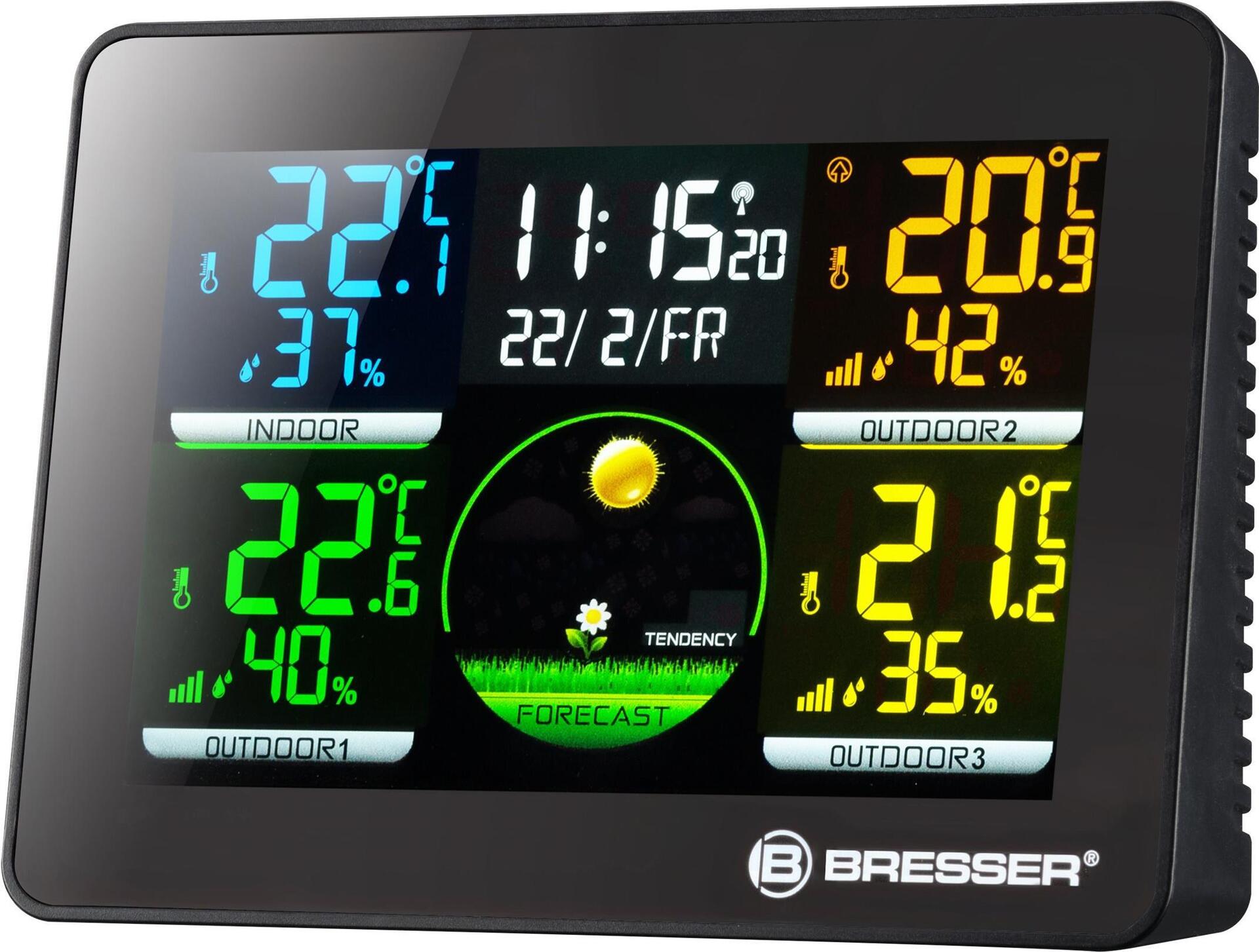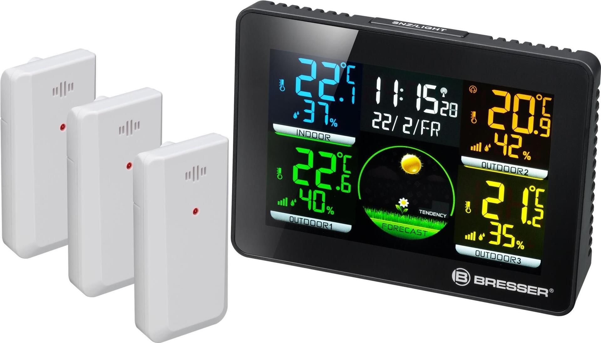Das BRESSER Thermo Hygro Quadro NLX bietet wie Temeo Hygro Quadro die Möglichkeit an 4 unterschiedlichen Messpunkten gleichzeitig die Temperatur und Luftfeuchtigkeit zu messen. Zusätzlich wird bei diesem Gerät auch der Wettertrend, sowie Uhrzeit und Datum auf dem übersichtlich gestalteten Farbdisplay angezeigt.Die drei Fernsensoren liefern über 433 MHz Funkfrequenz die Daten an die Empfangsstation, gleichzeitig misst die Empfangsstation auch Temperatur und Luftfeuchtigkeit und liefert somit 4 Messergebnisse.