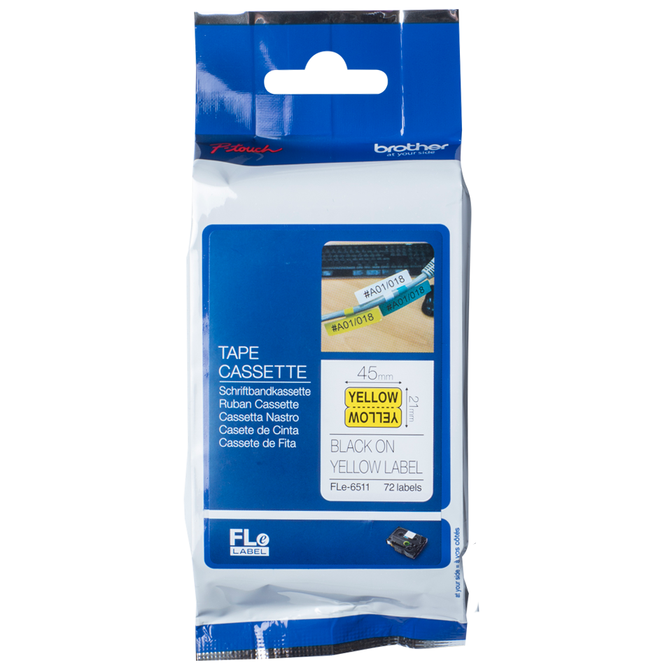 Das Original Brother FLe-6511 Schriftband mit schwarzer Schrift auf gelbem Hintergrund ist für verschiedene Anwendungszwecke geeignet und kann unter anderem zur eindeutigen Identifikation von Kabeln verwendet werden. Auch im Einzelhandel sind die Einzelfähnchen-Etiketten ideal, um zum Beispiel Preise auszuzeichnen.