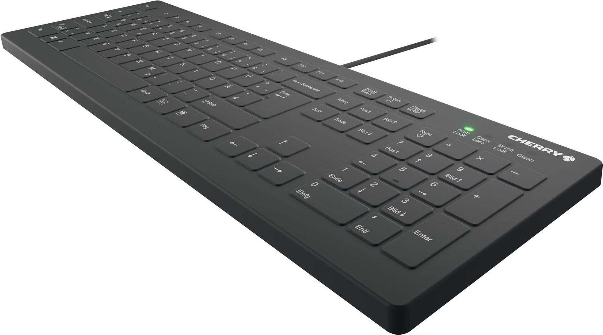 Desinfizierbare Desktop-Hygienetastatur mit flachem Tastenprofil.