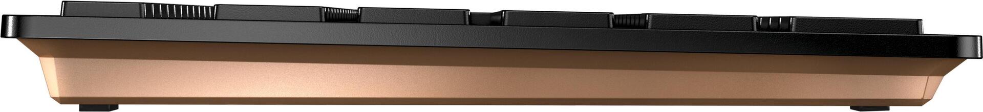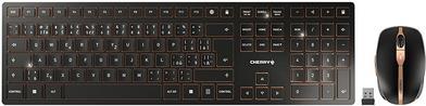Beim CHERRY DW 9100 SLIM treffen innovative Funktionen, herausragende Verarbeitung und sehr flaches Design aufeinander. Der Mix aus Ästhetik und optimalem Bedienkomfort ist eine Bereicherung für jeden modernen Schreibtisch. Perfekt.Produkttext[/head]Wiederaufladbares Design-Desktop mit vielen ExtrasDas CHERRY DW 9100 SLIM Desktop-Set begeistert durch innovative Funktionen, herausragende Verarbeitung und extra flaches Design. Verbinden Sie die Funkmaus und Tastatur wahlweise mit dem beiliegenden 2,4 GHz-Funk USB-Empfänger oder per Bluetooth®. Durch einen Schalter an der Wireless Maus bzw. Tastatur wechseln Sie blitzschnell zwischen diesen Verbindungsarten. So lässt sich z. B. ein Notebook per Bluetooth® 4.2 und zusätzlich ein PC über Funk mit dem gleichen Desktop bedienen. Die Übertragung der Daten erfolgt in beiden Fällen mit einer AES-128-Verschlüsselung. Die Reichweite von bis zu 10 Metern ist dabei z. B. auch für Multimedia Anwendungen am Fernseher ausreichend.Das CHERRY DW 9100 SLIM Set verfügt über wiederaufladbare Lithium Akkus, die wochenlanges Arbeiten ermöglichen. Danach laden Sie die Funkmaus und Tastatur bequem über das beiliegende USB-C Kabel, auch während des Arbeitens. Damit die Akkus auch nach dem Urlaub noch geladen sind, lassen sich die drahtlose Tastatur und Maus über einen Schalter komplett ausschalten.Die Tastatur enthält eine eingebaute Metallplatte, die ihr maximale Standfestigkeit und Stabilität verleiht. Falls Sie beim Tippen einen steileren Winkel bevorzugen, können Sie die Funktastatur mit der abnehmbaren Magnet-Leiste entsprechend anpassen. Auch dann sorgt die Metall-Platte für eine hohe Stabilität und beugt Durchbiegen und Prellen beim Schreiben vor.Das optimale Schreibgefühl wird durch die Verwendung von hochwertiger Scherenmechanik mit geringem Tastenhub erreicht. Eingebaute Status LEDs direkt in den jeweiligen Tasten geben Auskunft, wenn die Hochstelltaste, die Rollen-Taste oder die Num-Lock-Taste aktiviert ist. Zusätzlich geben diese Tasten über ein Blinken eine Warnung, wenn der Batterieladestand niedrig ist. Überaus komfortabel und praxisgerecht erweisen sich die 6 zusätzlichen Tasten: Windows Lock, Browser öffnen, Leiser, Lauter, Stumm und Taschenrechner öffnen.Optisch, perfekt dazu passend, wartet auch die kabellose Computer Maus mit zahlreichen Features auf. Gummierte Seitenteile und eine kompakte Form bewirken ein ideales Handgefühl. Die Auflösung lässt sich 3-stufig per Knopfdruck einstellen: 1000, 1600 oder 2400 dpi. Eine zweifarbige Status-LED gibt Ihnen dabei jederzeit Auskunft über den Batteriestatus, den Ladestatus, die gewählte Auflösung oder den Verbindungsstatus. Ein extra langlebiges Mausrad mit optischer Abtastung und eine magnetische Verstaumöglichkeit für den USB-Receiver sind weitere Details, die keine Wünsche offenlassen.Egal ob für mobiles Arbeiten, im Office oder Home Office: Das DW 9100 SLIM Desktop ist immer Ihr stilvoller Begleiter. Mit wahlweiser Bluetooth® oder Funk-Verbindung bleiben Sie flexibel und sind für alle Eventualitäten gerüstet.[head]Hauptmerkmale