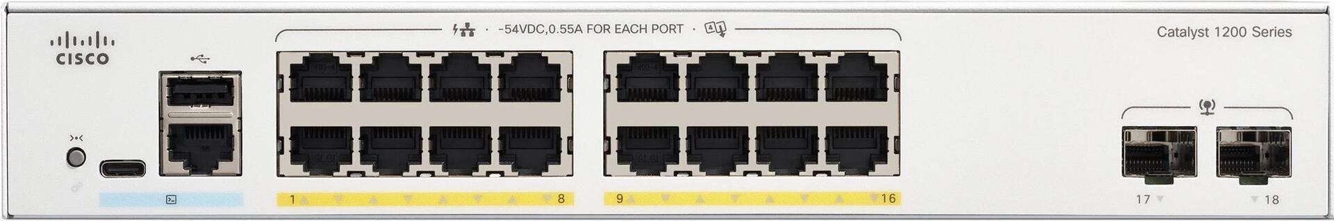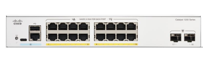 • Cisco Catalyst C1200-16P-2G Switch -16 ports 10/100/1000 + 2x 1GE SFP (total PoE power budget: 120W, PoE, PoE+) (C1200-16P-2G)