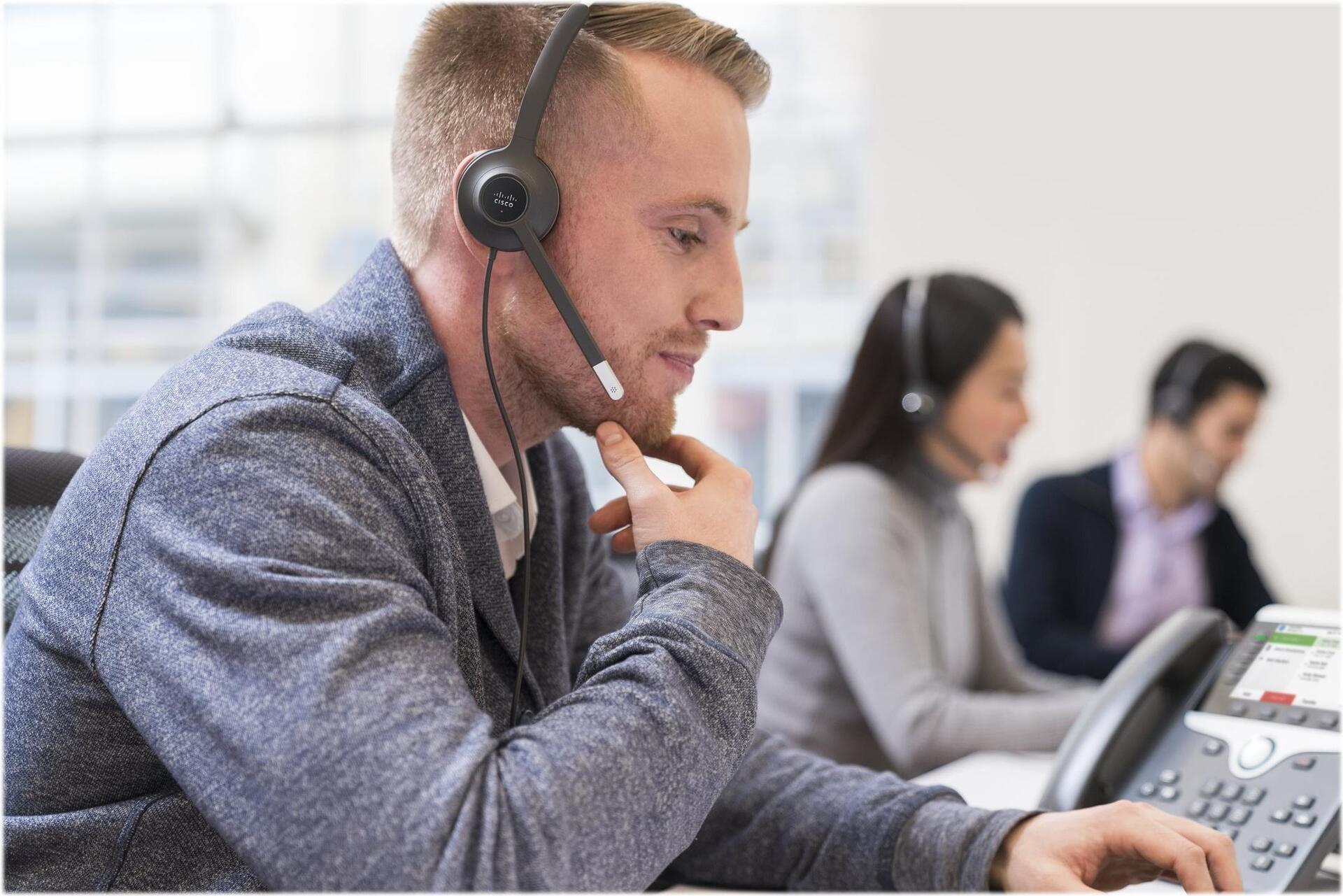 Die Cisco Headset 530-Serie liefert einen lebendigen Klang und eine starke Geräuschisolierung und ist damit die ideale Wahl für die Telekommunikation in lauten, offenen Arbeitsbereichen. Durch die Inline-Schnellkupplung mit schnellen Zyklen kann der Benutzer das Headset bei Schichtwechsel oder in den Pausen einfach ein- und ausstecken. Es bietet flexible Optionen für den Anschluss von Geräten, einschließlich Unterstützung für USB- oder RJ-9-Verbindungen.