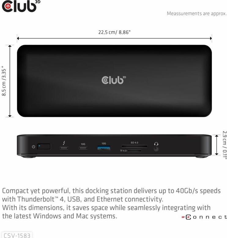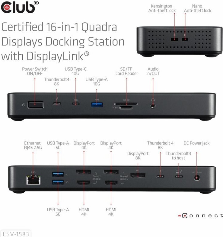 | Produktbeschreibung | Club 3D 16-in-1 - Dockingstation - USB-C / USB4 / Thunderbolt 3 / Thunderbolt 4 - 2 x Thunderbolt 4, 3 x DP, 2 x HDMI - 2.5GbE |