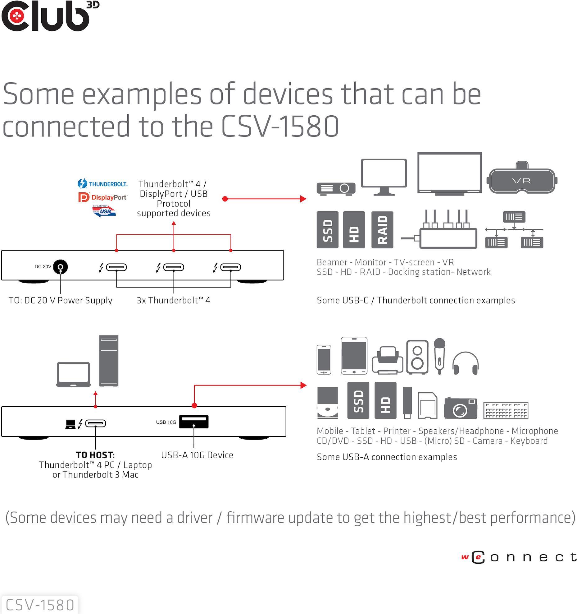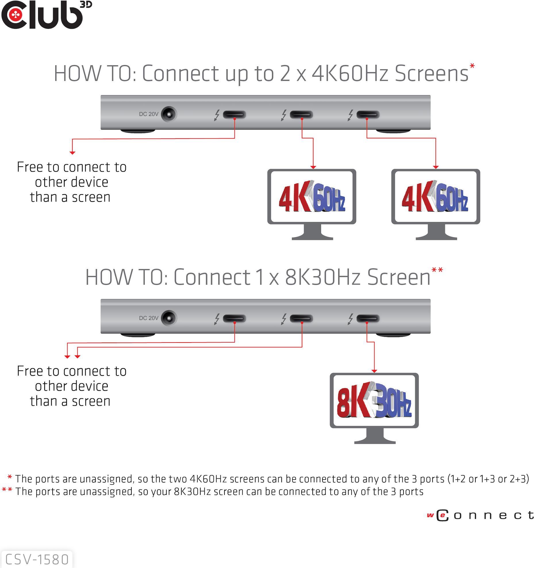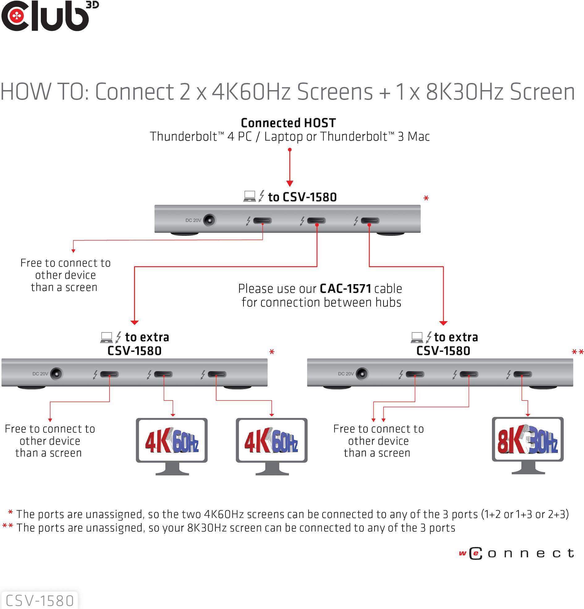 Der Club 3D CSV-1580 ist ein zertifizierter und portabler Thunderbolt 4 Hub, der die fortschrittlichsten, effizientesten und vielseitigsten I/O (Eingabe/Ausgabe) Lösungen mit 40Gb/s für Daten und Video liefert. Erstmals hat dieser moderne Thunderbolt 4 Hub drei Thunderbolt 4 Ausgänge, die es Ihnen ermöglichen Thunderbolt 4 Produkte hintereinander zu schalten, zu einem 8K30Hz oder zwei 4K60Hz Monitoren, kann einfach mit jeglichen USB Typ-C Produkten verbunden werden und all dies während gleichzeitig der PC/Laptop geladen wird.