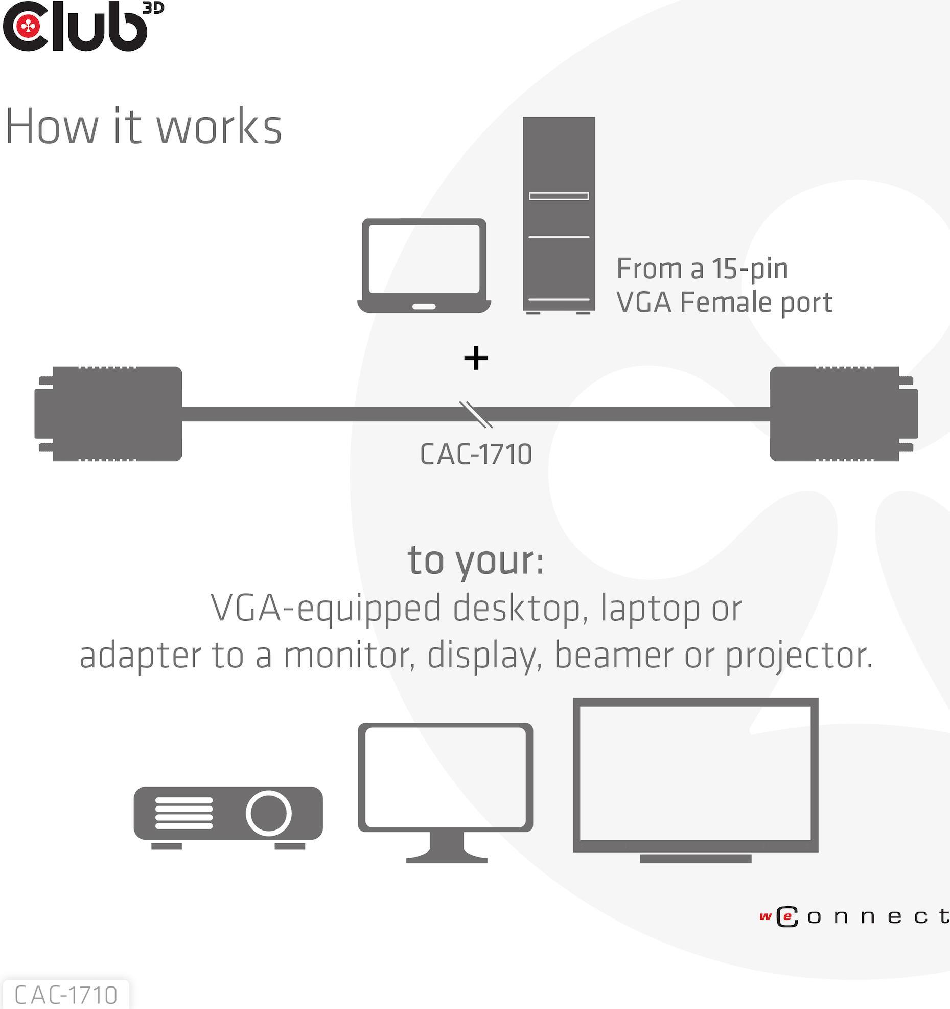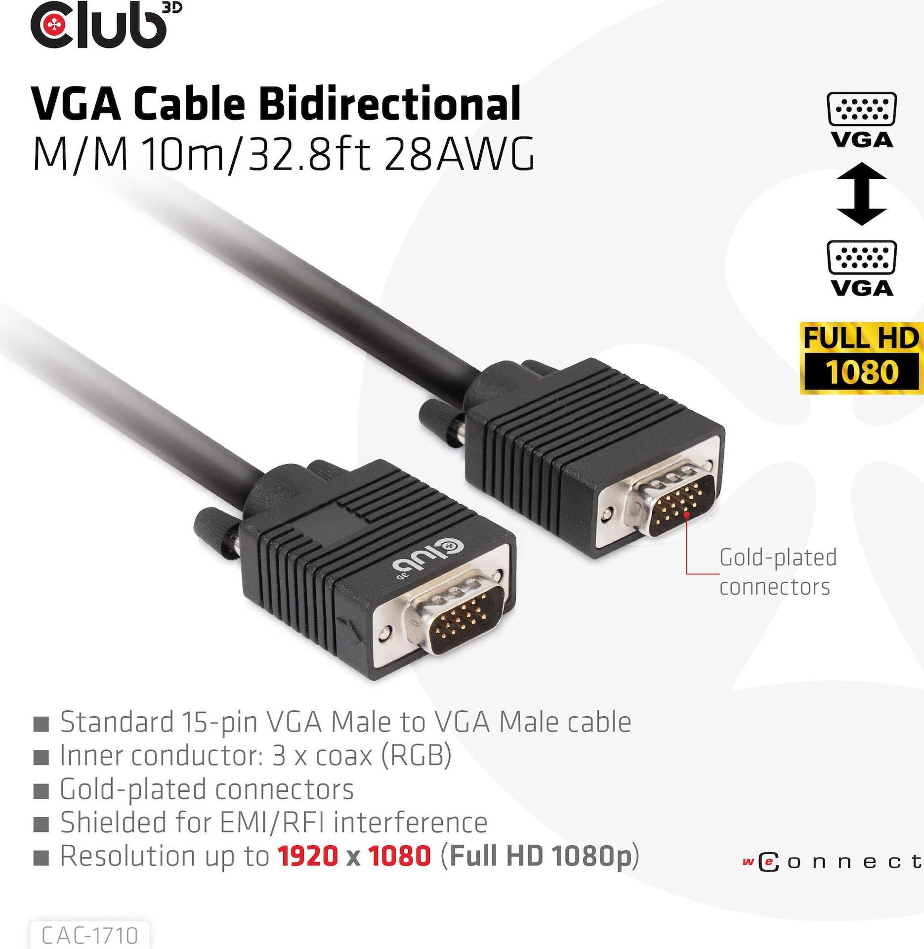 Das bidirektionale Club 3D CAC-1710 VGA-Kabel St./St. 10 m 28AWG verbindet jeden mit VGA ausgestatteten Desktop, Laptop oder Adapter mit einem Monitor, Display, Beamer oder Projektor mit einer 15-poligen VGA-Buchse. Ideal für zu Hause oder bei der Arbeit, stellt das Kabel eine zuverlässige Verbindung für alles vom Gaming bis zur Videoprojektion her und unterstützt bis zu Full HD 1080p (max. Auflösung von 1920 x 1080).