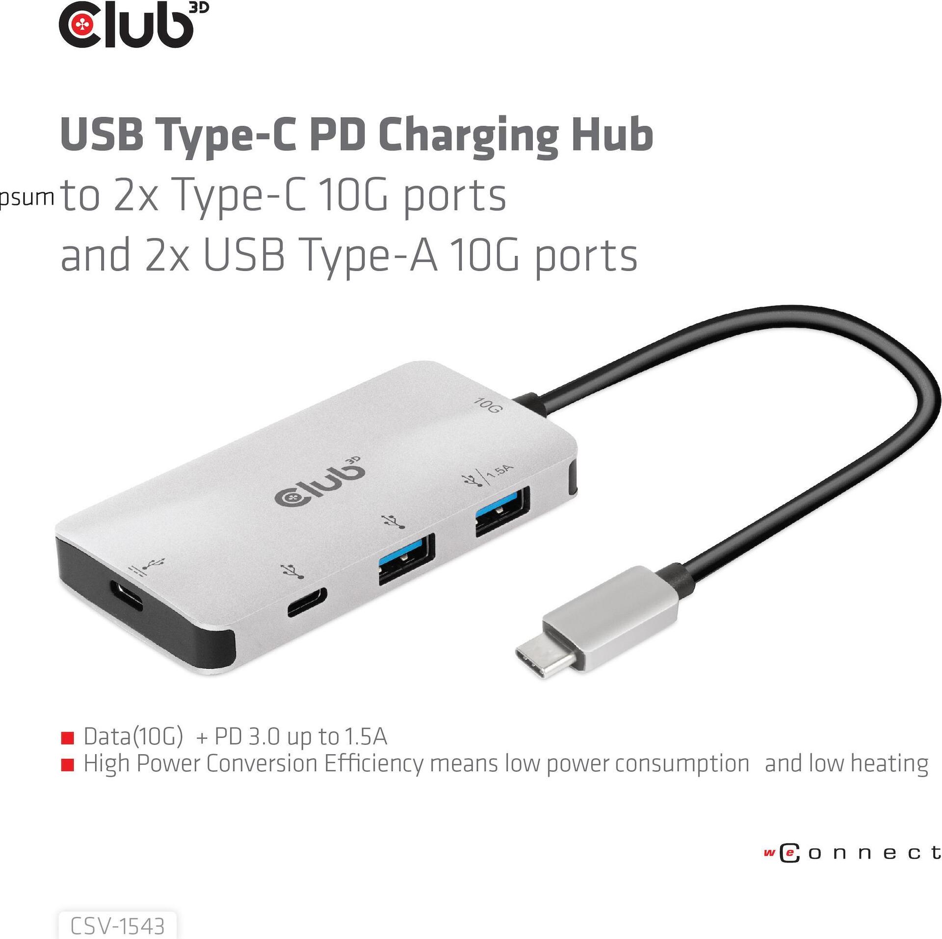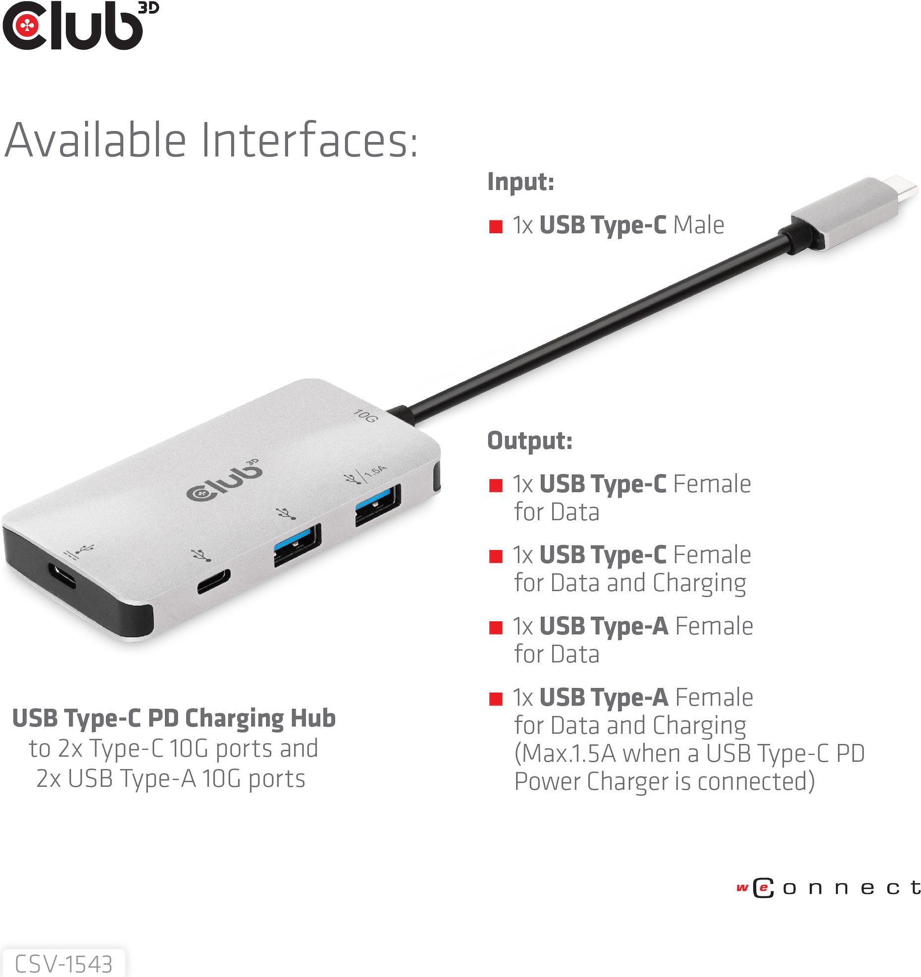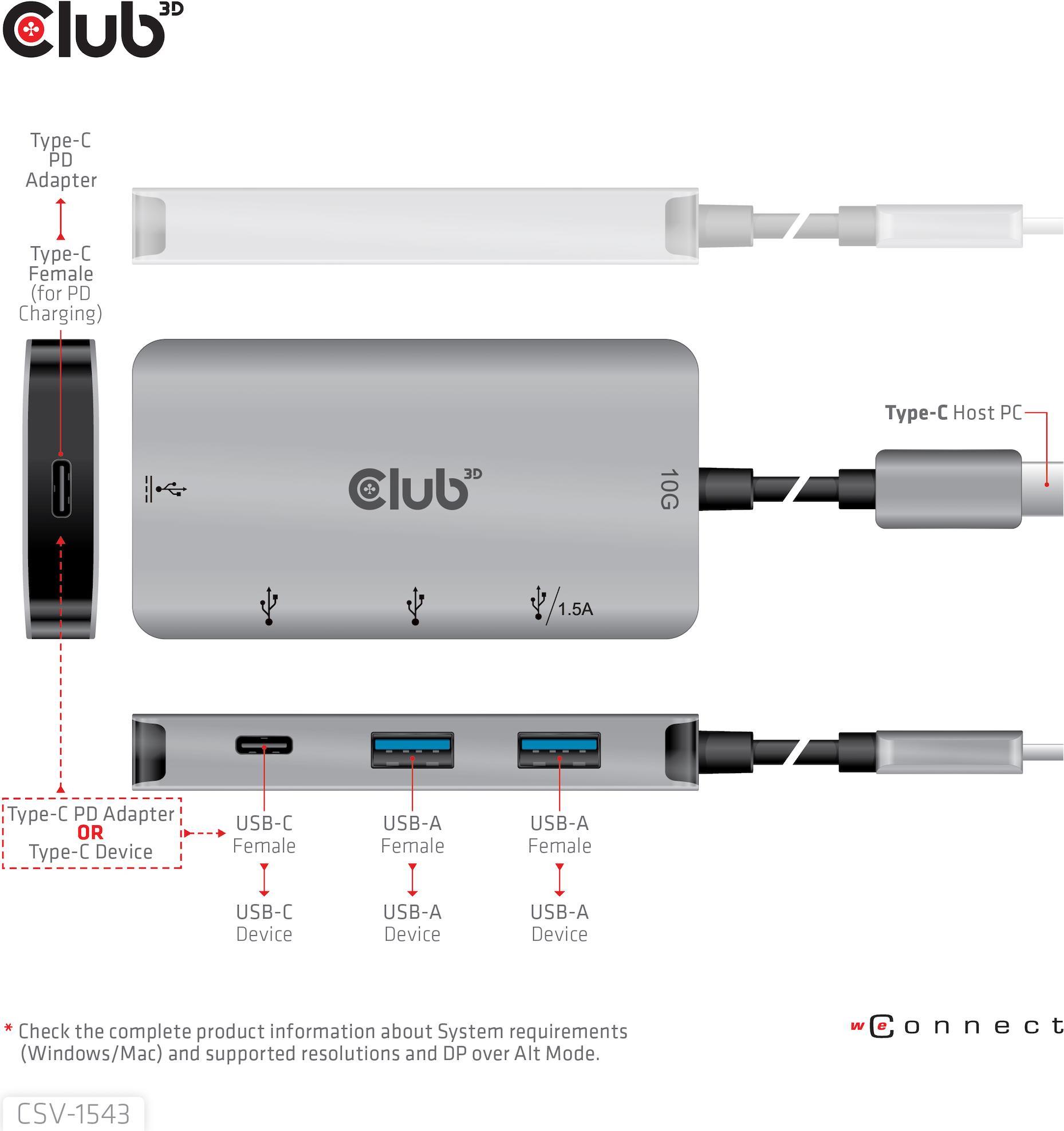 Der Club 3D CSV-1543 ist ein USB Gen2 Typ-C PD Lade-Hub auf 2x Typ-C 10G Ports und 2x USB-Typ-A 10G Ports. Die zwei Typ-A-Anschlüsse sind für Datenübertragung gedacht und einer davon kann die angeschlossenen USB-Typ-A-Geräte (Mobiltelefone, Tablets, U-Disk usw.) mit 1,5 A aufladen. Einer der beiden USB-Typ-C-Ports ist für die Datenübertragung und das Laden des angeschlossenen USB-Typ-C-Geräts ausgelegt, der andere USB-Typ-C-Port unterstützt sowohl den Datentransfer als auch das PD3.0-Laden. Es kann auf jedem USB-Typ-C-Host (PC, Notebook, Tablet, Mobiltelefon usw.) verwendet werden, der den DP-Alt-Modus unterstützt.