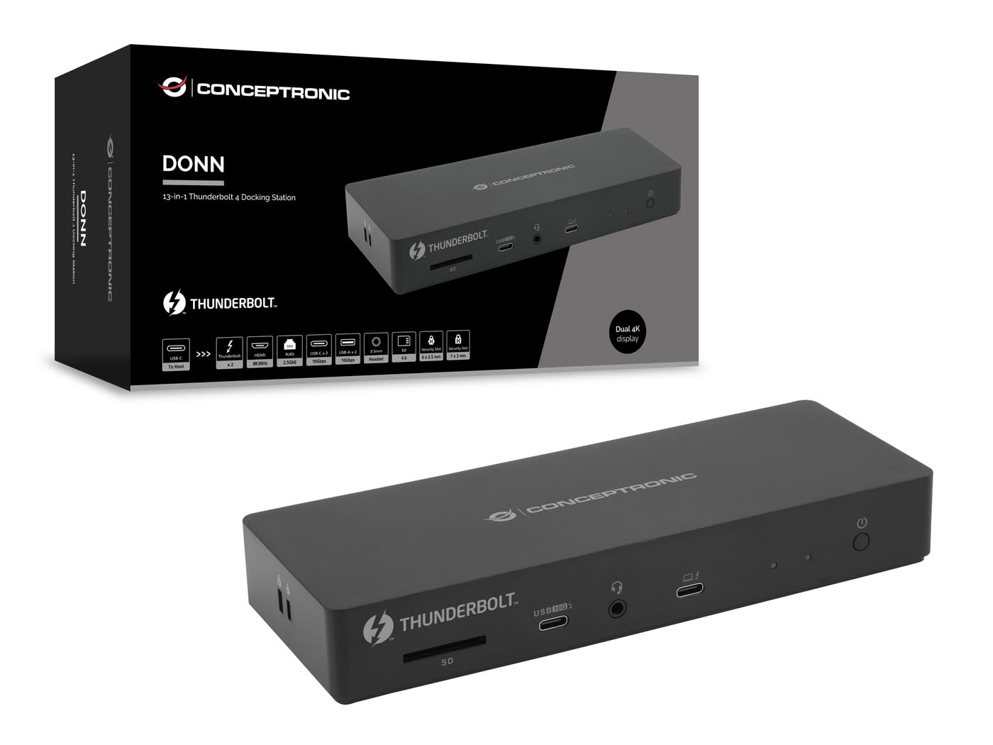 Conceptronic 13-1 Dock USB-C->HDMI 2xUSB-A USB-C GbE 96W (DONN30B)Verwandeln Sie Ihr digitales Erlebnis mit der Premium 13-in-1 Thunderbolt 4 Dockingstation – der ultimativen Konnektivitätslösung, die für Profis entwickelt wurde, die Exzellenz fordern. Ein Port wird Ihr Gateway zu unbegrenzten Möglichkeiten: Genießen Sie visuelle Brillanz mit dualen erweiterten Displays über macOS und Windows und beeindruckende Klarheit mit HDMI-Ausgang bis zu 8K bei 30Hz, was fortschrittliche Multi-Monitor-Setups für maximale Produktivität ermöglicht.Erleben Sie unübertroffene Konnektivität mit zwei Thunderbolt 4-Ports für ultraschnelle Geräteintegration, vier leistungsstarke USB-Ports (2× USB-C, 2× USB-A) mit Unterstützung für 10Gbps Übertragungsgeschwindigkeit, einem professionellen SD 4.0 Kartenleser mit UHS-II-Unterstützung (bis zu 312 MB/s) und fortschrittlichem 2,5GbE Ethernet mit MAC-Adressen-Passthrough für Netzwerksicherheit auf Unternehmensebene.Nutzen Sie die USB PD 3.0 Host-Ladung von bis zu 96W für Ihren Arbeitsablauf, genießen Sie kristallklaren Sound über den integrierten 3,5-mm-Anschluss und profitieren Sie von einer intuitiven Stromverwaltung über die integrierte Einschalttaste. Verbesserten physischen Schutz gewährleisten auch die Standard- und Nano-Sicherheitsanschlüsse.Ob Sie kreative Inhalte erstellen, Fernarbeitsabläufe verwalten oder eine Hochleistungs-Workstation optimieren – diese Thunderbolt 4 Dockingstation bietet außergewöhnliche Leistung bei ausgefeilter Einfachheit. Ein Gerät. Vollständige Konnektivität. Grenzenloses Potenzial.