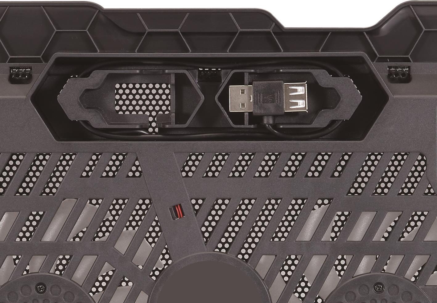 Das USB-Kabel verfügt über einen Passthrough-Anschluss, sodass alle USB-Ports am Gerät verfügbar bleiben. Die Kühlunterlage besitzt ein rutschfestes Design, damit das Gerät zentral auf der Unterlage bleibt. Eine praktische und vielseitige Ergänzung für mobiles Arbeiten und Spielen.