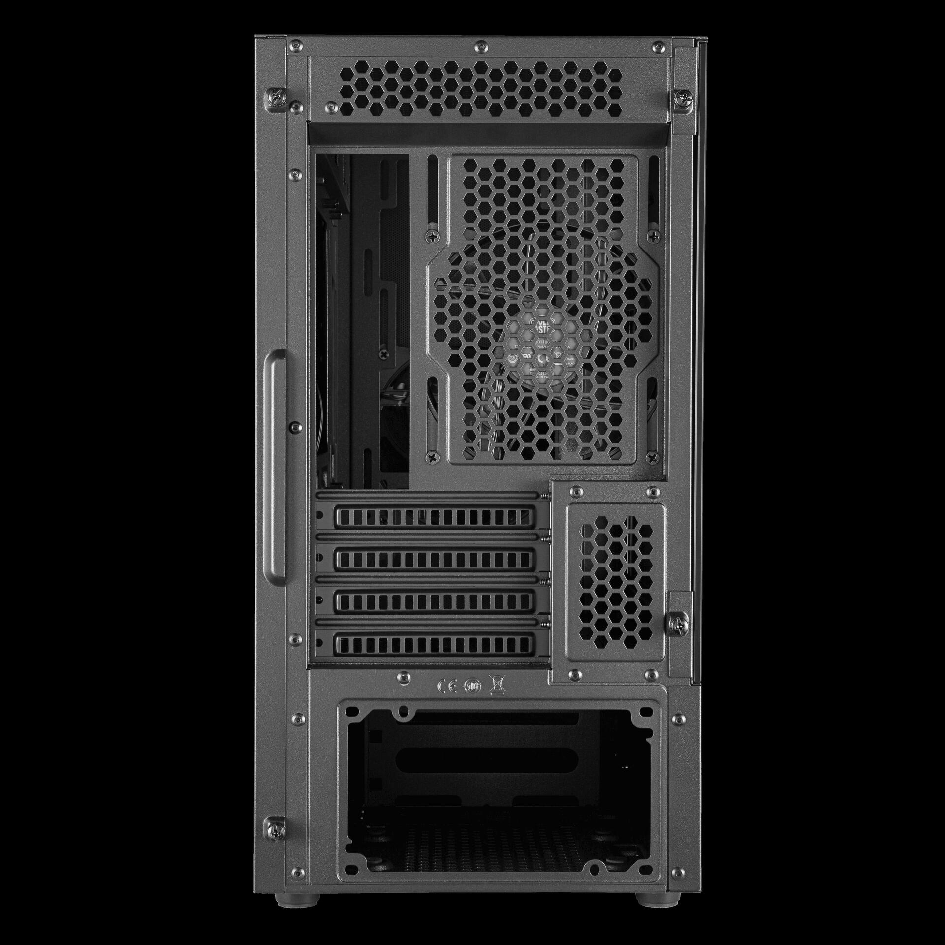 Die optimierte Ausnutzung des Innenraums bietet ausreichend Platz für ein kompaktes Micro-ATX Setup. Die MasterBox NR400 hat eine Seitenscheibe aus Echtglas, die mit Rändelschrauben an der Rückseite und somit unsichtbar befestigt ist.