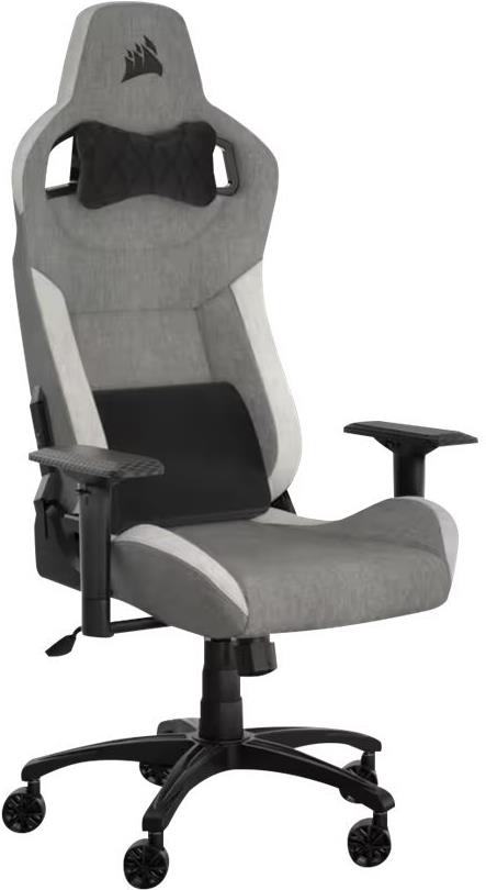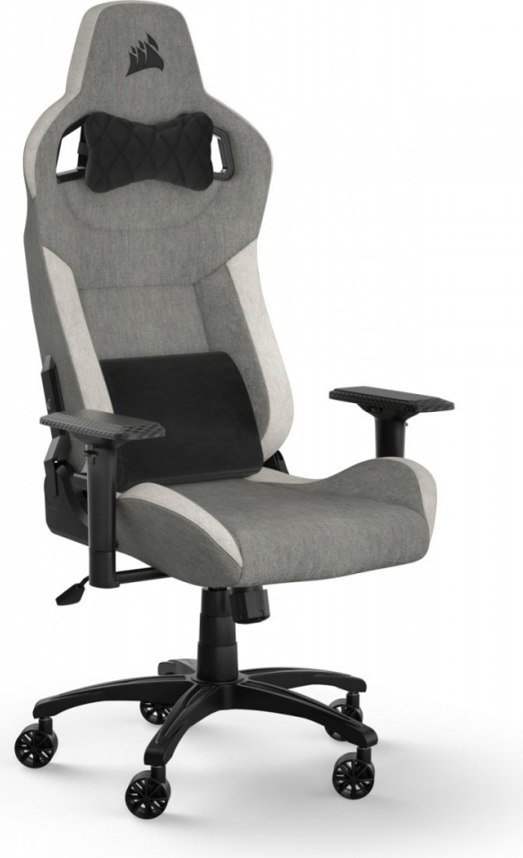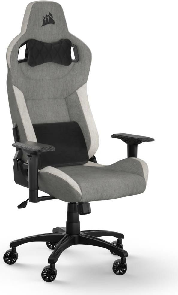 Der CORSAIR T3 RUSH Gaming-Stuhl kombiniert rennsportinspiriertes Design und konturierten Komfort mit einem atmungsaktiven, weichen Stoffbezug, einem gepolsterten Nackenkissen und einer Lendenwirbelstütze aus Memory-Schaum.