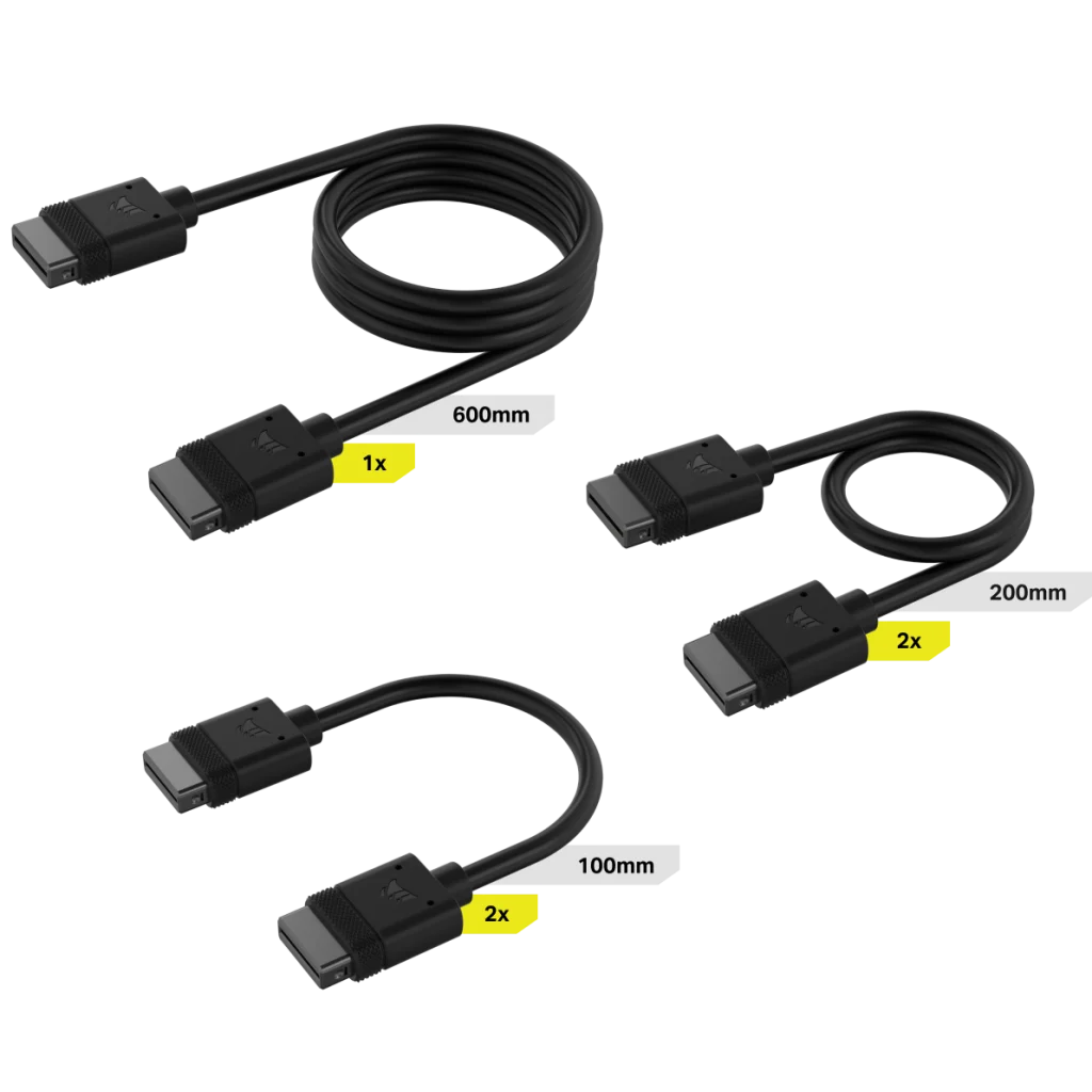 | Informationen zu den Bestandteilen des Kabelsatzes | 1 x Netz-/Datenkabel - CORSAIR iCUE Link zu CORSAIR iCUE Link - 60 cm 1 x Netz-/Datenkabel - CORSAIR iCUE Link zu CORSAIR iCUE Link - 20 cm 1 x Netz-/Datenkabel - CORSAIR iCUE Link zu CORSAIR iCUE Link - 10 cm |