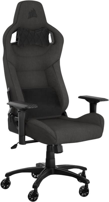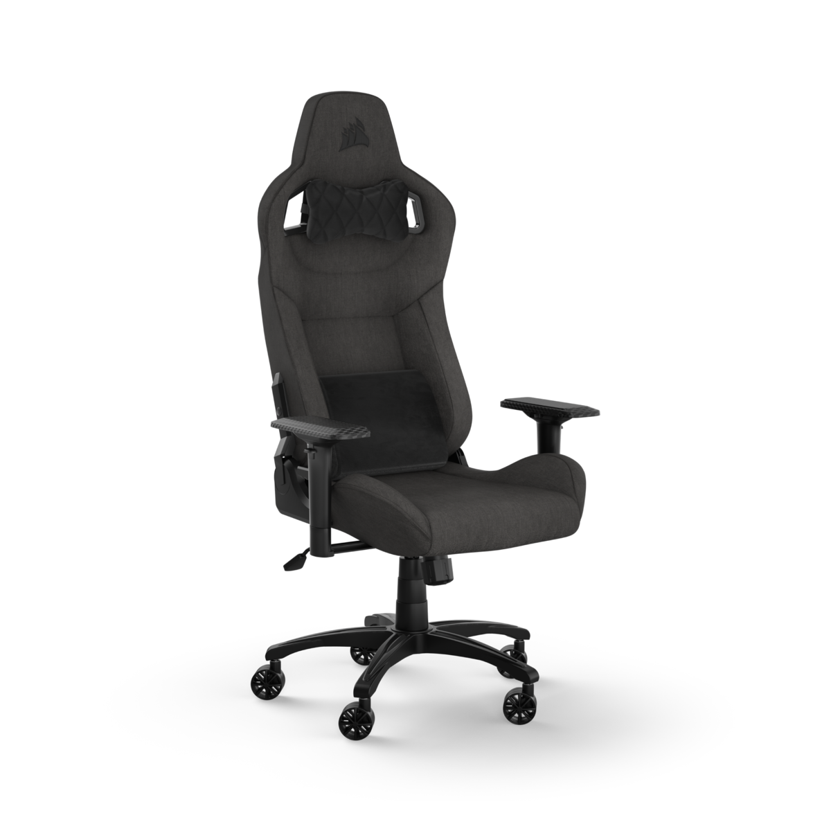 Der CORSAIR T3 RUSH Gaming-Stuhl kombiniert rennsportinspiriertes Design und konturierten Komfort mit einem atmungsaktiven, weichen Stoffbezug, einem gepolsterten Nackenkissen und einer Lendenwirbelstütze aus Memory-Schaum.