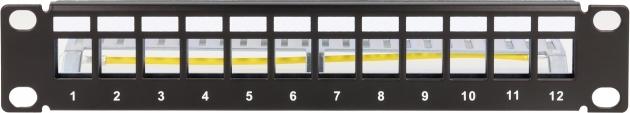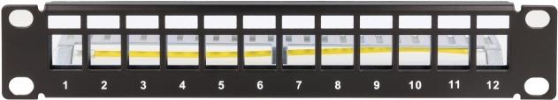 Dieses Patchpanel von Delock kann zum Einbau in einen 10'' Netzwerkschrank verwendet werden. Durch die standardisierten Abmessungen ist es zur einfachen Snap-In Montage von 12 Keystone Modulen geeignet.