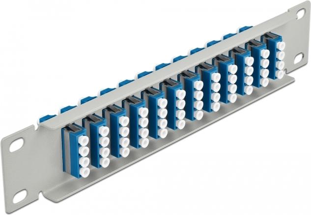 Dieses Patchpanel von Delock ist mit zwölf LC Quad Kupplungen ausgestattet und eignet sich für den Einbau in einen 10" Netzwerkschrank. Mit den LC Quad Kupplungen können LWL Stecker einfach miteinander verbunden werden.