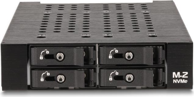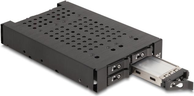 BeschreibungDieser stabile Metallwechselrahmen von Delock kann in einen 3.5? Schacht eines PCs eingebaut werden und stellt vier M.2 Slots im 2280, 2260, 2242 oder 2230 Format zur Verfügung.Schnelles Wechseln der SSDsDurch den besonderen Mechanismus können die SSDs schnell und unkompliziert ausgetauscht werden. So können z. B. Datensicherungen entnommen und an einem sicheren Ort aufbewahrt werden.Einschub mit Schloss und FederungDamit nur Befugte die Festplatte entnehmen können, verfügt der Wechselrahmen über ein Schlüsselschloss. Der stabile Träger aus Metall besitzt an der Ober- und Unterseite Federn, welche die Vibrationen absorbieren und somit auch einen Einsatz in mobilen Geräten unterstützen.HinweisEs muss darauf geachtet werden, dass der Einschub vollständig eingeführt ist, da sonst keine Verbindung zur SSD hergestellt werden kann.Hauptmerkmale
