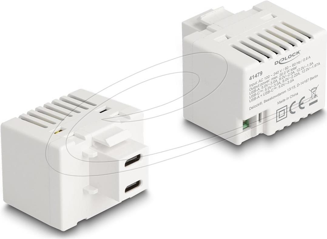 Das Netzteil Delock 41479 ist dank seiner Keystone-Modulkonfiguration vielseitig einsetzbar. Es liefert eine einstellbare Spannung von 5, 9 und 12 V und gewährleistet so die Kompatibilität mit verschiedenen Geräten bei einer Ausgangsleistung von 20 Watt. Mit zwei Ausgangsanschlüssen mit 24-poligen USB-C-Anschlüssen kann dieses Netzteil mehrere Geräte gleichzeitig aufladen und ist somit eine Option für Umgebungen mit unterschiedlichen Ladeanforderungen.