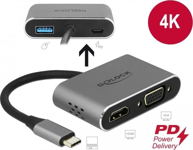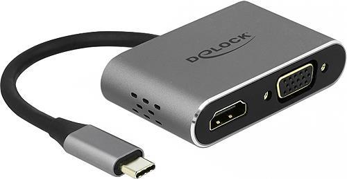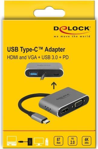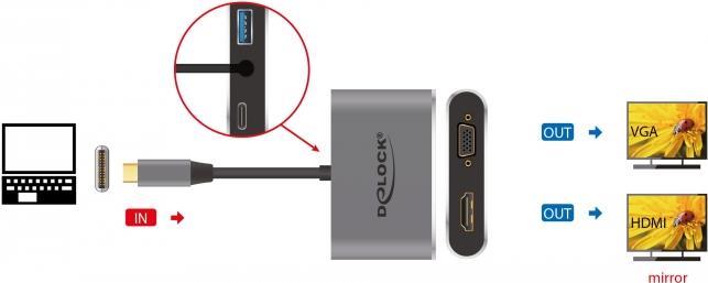 Dieser Adapter von Delock ist für den Anschluss eines VGA Monitors und eines HDMI Monitors an einen Computer mit USB-C Schnittstelle und DisplayPort Alternate Mode Unterstützung geeignet. Zwei Monitore können gleichzeitig an den Ausgängen betrieben werden. Zusätzlich besitzt der Adapter eine USB 3.0 Typ-A Schnittstelle für die Verwendung von Peripheriegeräten.
