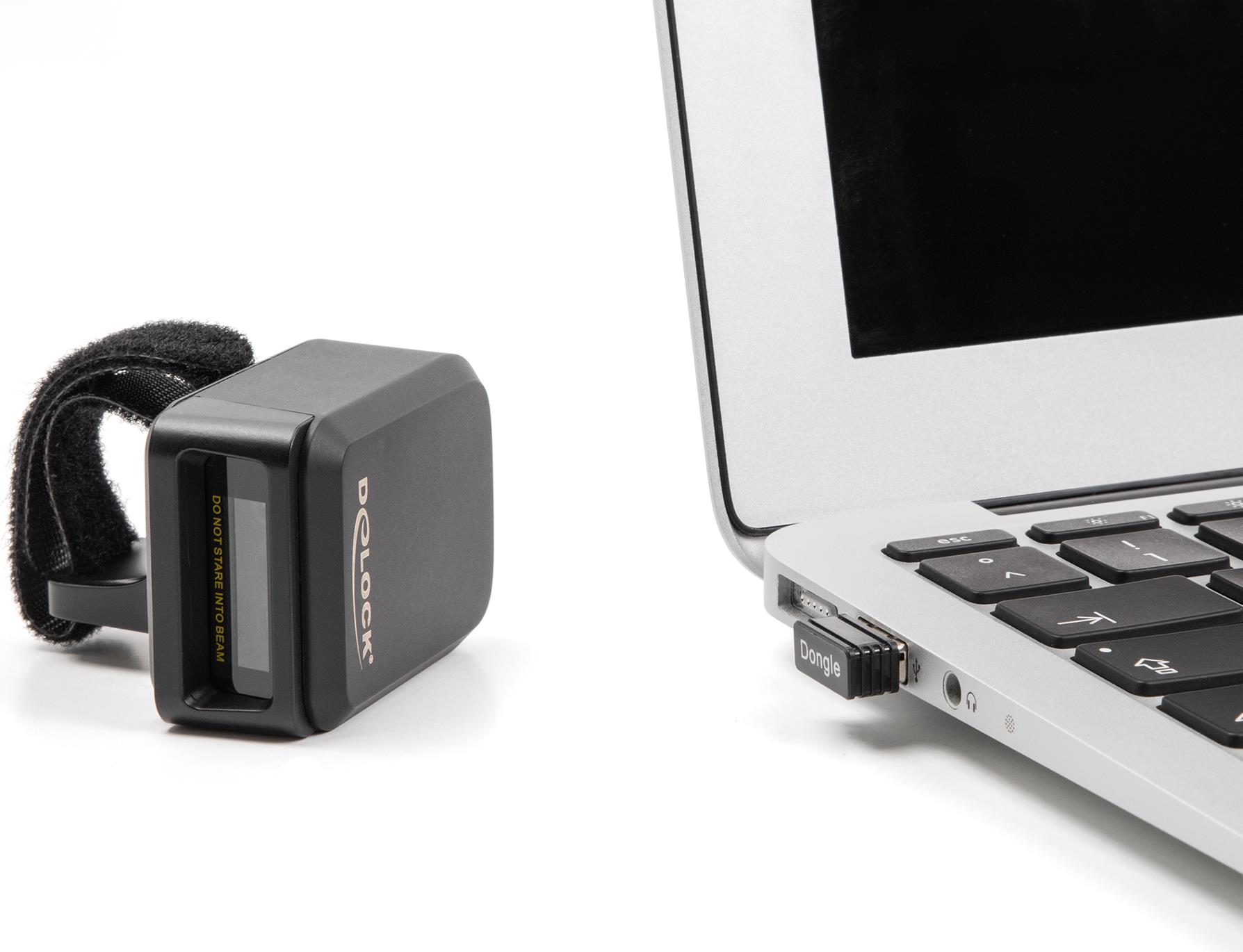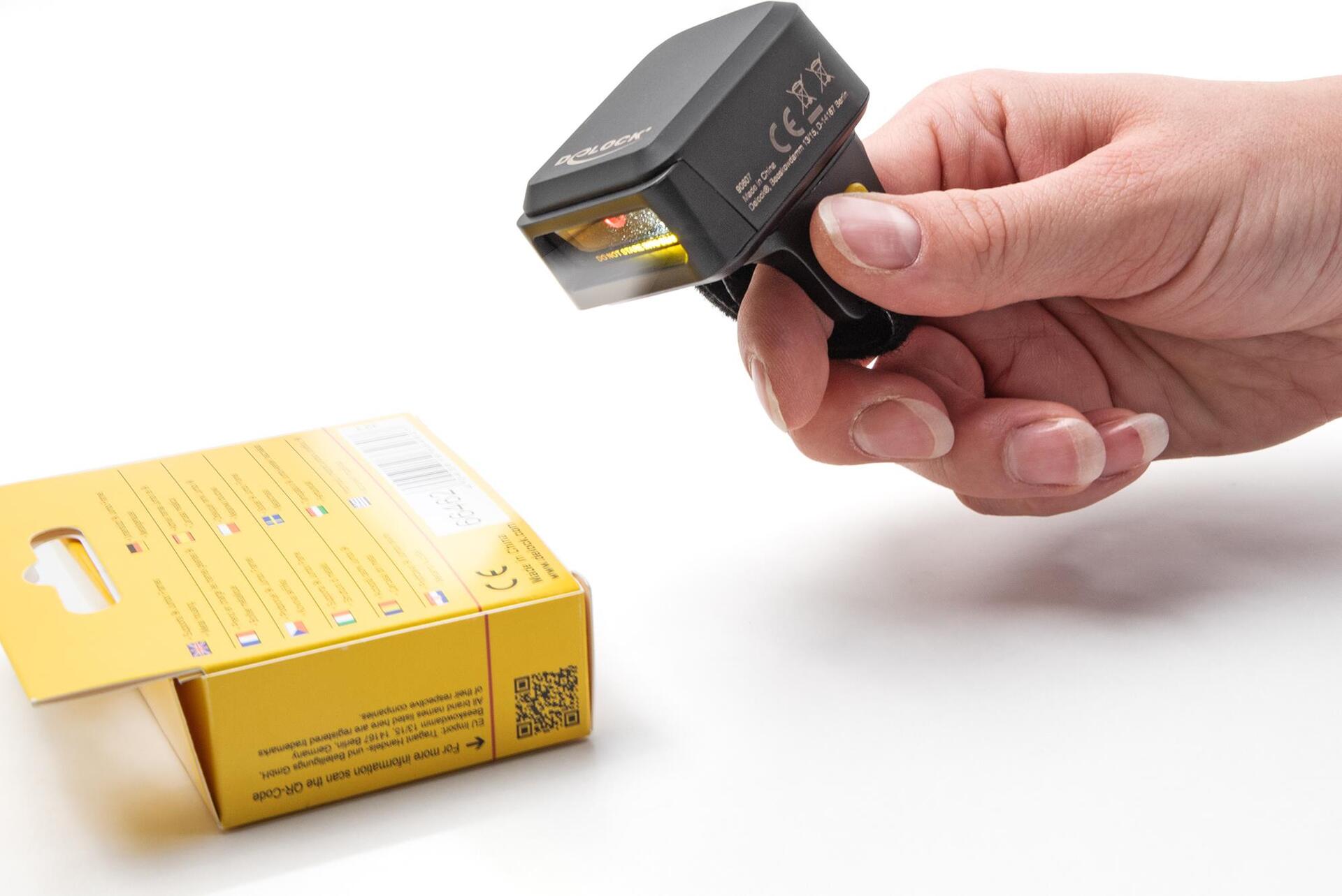 Dieser Ringbarcode Scanner von Delock kann mit einem PC, Notebook oder direkt mit dem Handy oder Tablet kabellos verbunden werden. Es können alle gängigen 1D und 2D Barcodetypen auch auf weite Entfernung präzise erfasst werden. Zusätzlich erkennt der Scanner auf Displays und Monitoren dargestellte Barcodes.Automatische Anpassung an UmgebungshelligkeitDer Scanner passt sich automatisch an die Umgebungshelligkeit an und erfasst unter optimalen Lichtverhältnissen bis zu 100 Scans in der Sekunde.Bei geringer Umgebungshelligkeit wird der Barcode durch eine zusätzliche weiße LED beleuchtet und ist somit auch bei schlechten Lichtverhältnissen einsetzbar.Klein und PraktischDieser kleine Ringscanner kann praktisch mit dem Klettverschluss am Finger befestigt werden, so dass der Träger die Hände frei hat, um zum Beispiel einen Karton zu halten. Dank der Rotationsvorrichtung lässt sich der Scanner drehen und ist somit für Rechts- wie auch Linkshänder geeignet.Übertragung via Bluetooth, USB oder 2,4 GHzDie Datenübertragung der gescannten Barcodes erfolgt entweder über Bluetooth direkt mit dem bluetooth fähigem Ausgabegerät oder über das 2,4 GHz Frequenzband mit Hilfe des beiliegenden USB Dongles. Alternativ kann der Scanner mit dem beiliegendem USB Kabel am Rechner verbunden werden.Kabelloses LadenDer Ringscanner kann entweder über die USB Type-C™ Buchse oder mittels der induktiven Ladefunktion im Scanner selbst geladen werden. Zum Beispiel mit der Delock Ladestation 90608.Hauptmerkmale