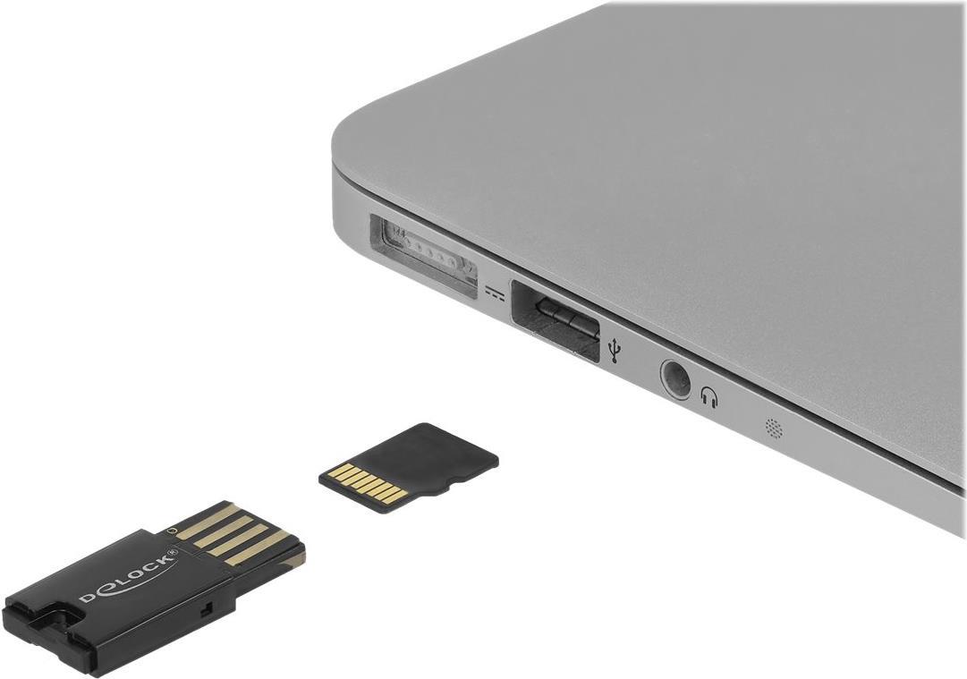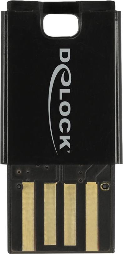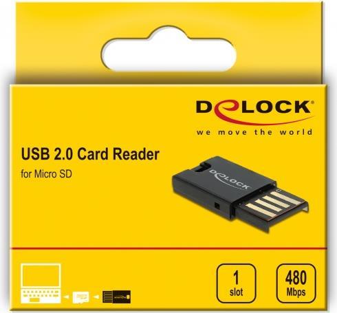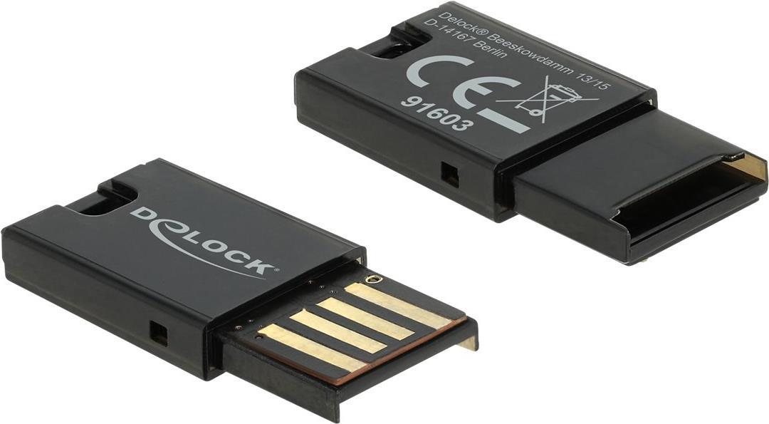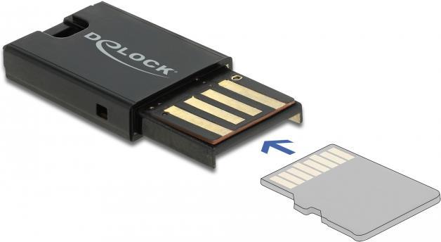 Dieser Card Reader von Delock kann zum Lesen und Beschreiben von Micro SD Speicherkarten verwendet werden. Über die USB Typ-A Schnittstelle wird der Card Reader an einen PC oder ein Notebook angeschlossen. Die Speicherkarte wird in den USB Typ-A Anschluss des Card Readers gesteckt.