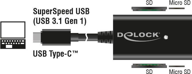 DeLOCK USB 3,1 Gen 1 Card Reader USB Type-C male 4 Slots - Kartenleser - All-in-one (MMC, SD, miniSD, RS-MMC, TransFlash, MMCmobile, microSD, MMCmicro, SDHC, miniSDHC, microSDHC, SDXC, microSDXC, SDHC UHS-I, microSDHC UHS-I) - USB-C (91740)