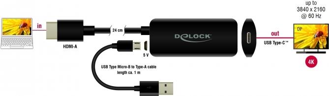 Mit diesem Adapter von Delock kann ein USB Type-C (DisplayPort Alternate Mode) Monitor an eine freie HDMI Schnittstelle eines PCs oder Notebooks angeschlossen werden. Der Adapter wird an die HDMI Buchse des PCs oder Notebooks angeschlossen und mit einem vorhandenen USB-C Kabel mit dem Monitor verbunden.