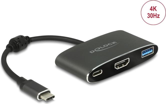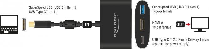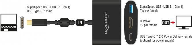Dieser Adapter von Delock ist für den Anschluss eines HDMI Monitors an einen Computer mit USB-C Schnittstelle und Displayport Alternate Mode Unterstützung geeignet. Somit kann der Adapter an verschiedenen Notebooks wie dem Macbook, Chromebook und ähnlichen angeschlossen werden. Außerdem kann der Adapter an einer Thunderbolt 3 Schnittstelle betrieben werden. Zusätzlich verfügt der Adapter über eine USB 3.1 Typ-A Buchse und eine USB-C Buchse. Die USB-C Buchse kann zur Stromversorgung des Ausgabegerätes verwendet werden oder um Daten in USB 2.0 Geschwindigkeit zu übertragen. Es können verschiedene USB Geräte, wie z. B. Docking Stationen, Card Reader, externe Gehäuse etc., angeschlossen werden.