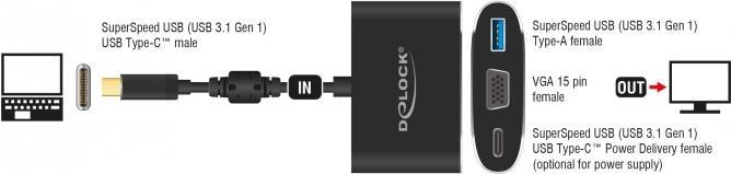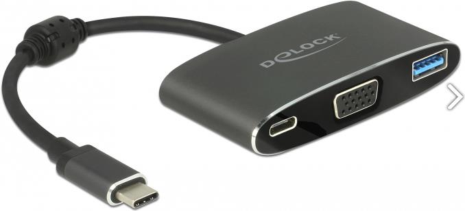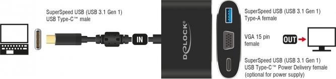 Dieser Adapter von Delock ist für den Anschluss eines VGA Monitors an einen Computer mit USB-C Schnittstelle und Displayport Alternate Mode Unterstützung geeignet. Somit kann der Adapter an verschiedenen Notebooks wie dem Macbook, Chromebook und ähnlichen angeschlossen werden. Außerdem kann der Adapter an einer Thunderbolt 3 Schnittstelle betrieben werden. Zusätzlich verfügt der Adapter über eine USB 3.1 Typ-A Buchse und eine USB-C Buchse. Die USB-C Buchse kann zur Stromversorgung des Ausgabegerätes verwendet werden oder um Daten in USB 3.1 Gen 1 Geschwindigkeit zu übertragen. Es können verschiedene USB Geräte, wie z.B. Docking Stationen, Card Reader, externe Gehäuse etc., angeschlossen werden.