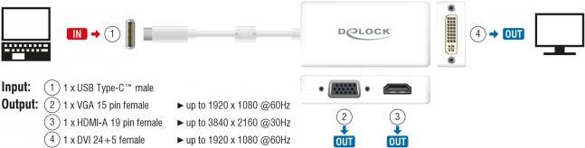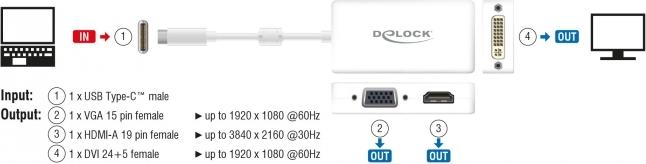 Dieser Delock Adapter ist für den Anschluss eines VGA, HDMI oder DVI Monitors an einen Computer mit USB-C-Schnittstelle und DisplayPort-Alternate-Mode-Unterstützung geeignet. Somit kann der Adapter an verschiedenen Notebooks wie dem MacBook, Chromebook und ähnlichen angeschlossen werden. Außerdem kann der Adapter an einer Thunderbolt-3-Schnittstelle betrieben werden. Es kann nur ein Monitor am Adapter betrieben werden.