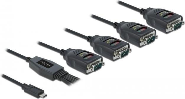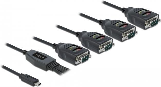 Dieser USB Type-C zu seriell Adapter von Delock bietet vier RS-232 DB9 Anschlüsse für Drucker, Messgeräte, Steuerungen, IoT Geräte etc. An jedem der RS-232 Ports zeigen drei LEDs den Sende- und Empfangsstatus sowie die USB Spannung an.