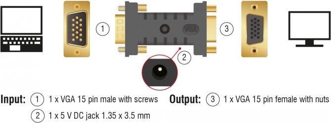 Dieser Adapter von Delock emuliert einen Monitor, so dass die Signalquelle auch ohne einen angeschlossenen Bildschirm das Signal nicht abschaltet oder die Auflösung verändert. Der Adapter enthält einen Standardsatz von EDID/DDC Daten, er kann aber auch die Daten eines angeschlossenen Monitors auslesen und speichern.