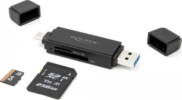 Dieser Card Reader von Delock verfügt über zwei Speicherkartenslots und ermöglicht das Lesen und Beschreiben von verschiedenen SD, MMC und Micro SD Speicherkarten. Über die USB Type-C oder die USB Typ-A Schnittstelle wird der Card Reader an einen PC oder an ein mobiles Gerät angeschlossen.