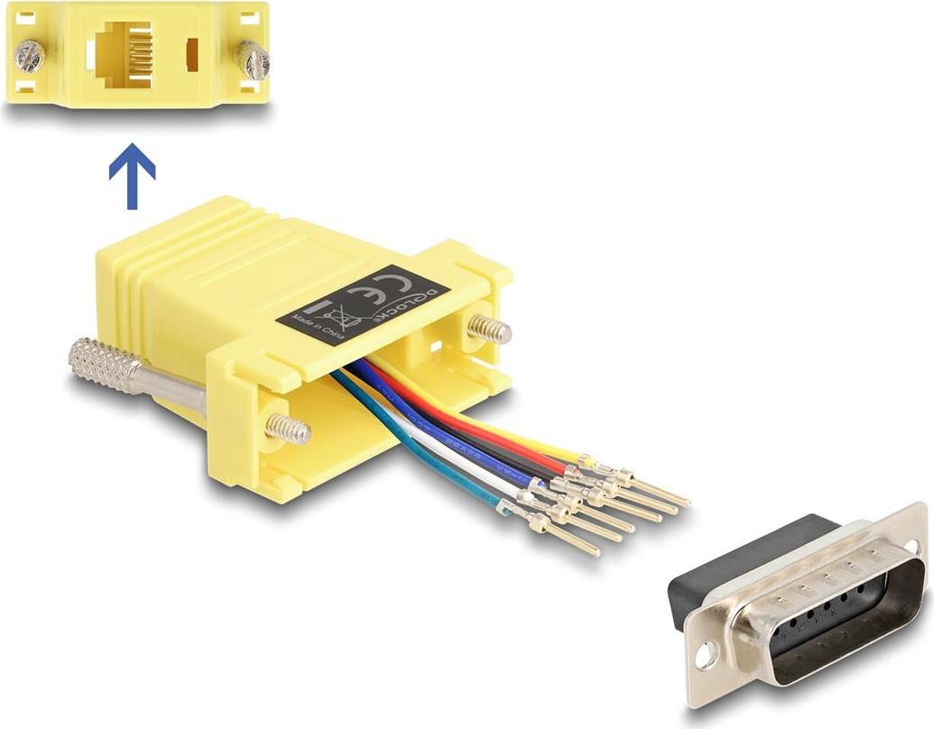 Das Delock Assembly Kit wurde für vielseitige Anschlussmöglichkeiten entwickelt, wobei der Schwerpunkt auf der Benutzerfreundlichkeit liegt. Dieses Kabel verfügt über einen 15-poligen D-Sub-Stecker (DB-15) an einem Ende und eine RJ-12-Buchse (6-polig) am anderen Ende, was eine flexible Integration in verschiedene Systeme ermöglicht. Es bietet eine individuell zuweisbare serielle Schnittstelle, die es dem Benutzer ermöglicht, die Verbindungen an seine spezifischen Bedürfnisse anzupassen.