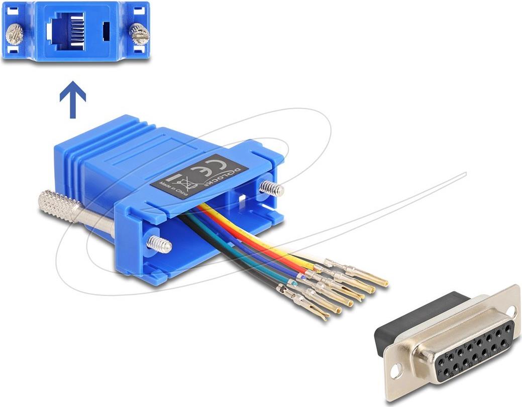 Das serielle Adapterkabel Delock 67090 ermöglicht den Anschluss verschiedener Geräte und verfügt über einen 15-poligen D-Sub-Stecker (DB-15) an einem Ende und eine RJ-12-Buchse am anderen Ende. Dieses Design gewährleistet Kompatibilität mit mehreren Systemen und bietet gleichzeitig eine hohe Leistung. Das Kabel ist mit Rändelschrauben zur sicheren Befestigung ausgestattet, die ein versehentliches Lösen verhindern und eine robuste Verbindung während des Gebrauchs gewährleisten.